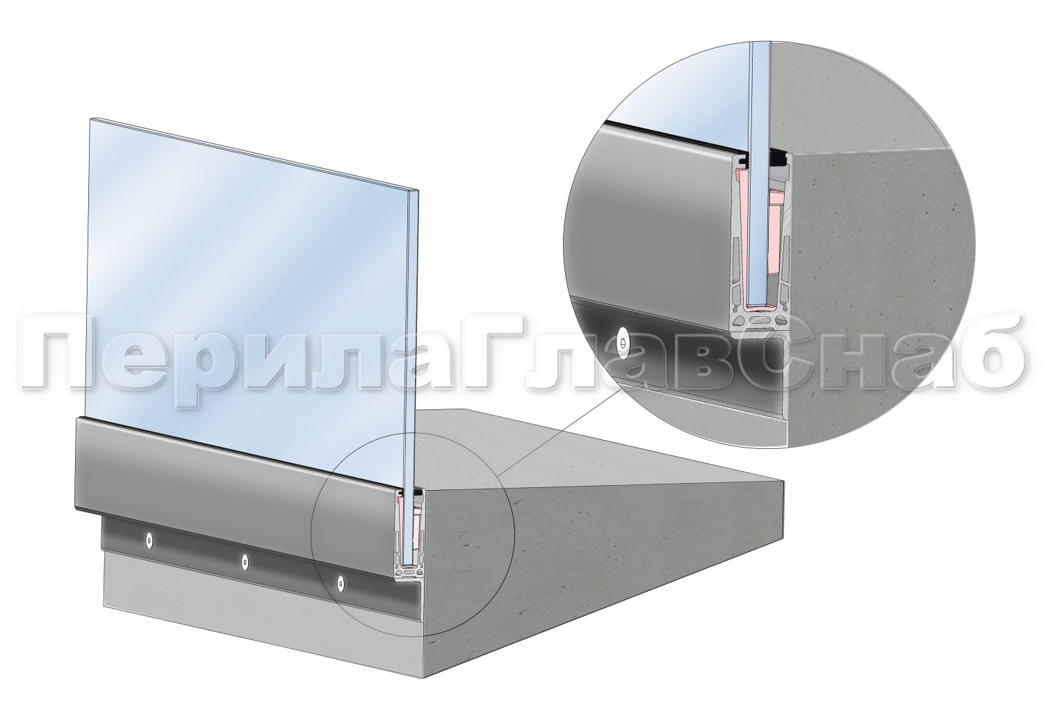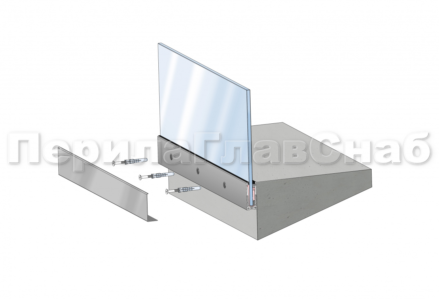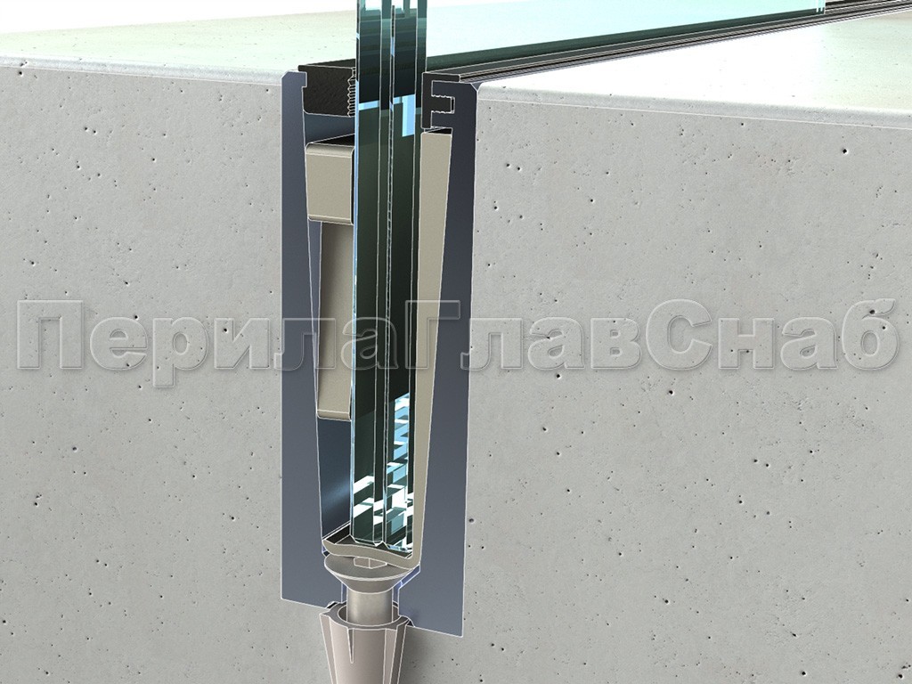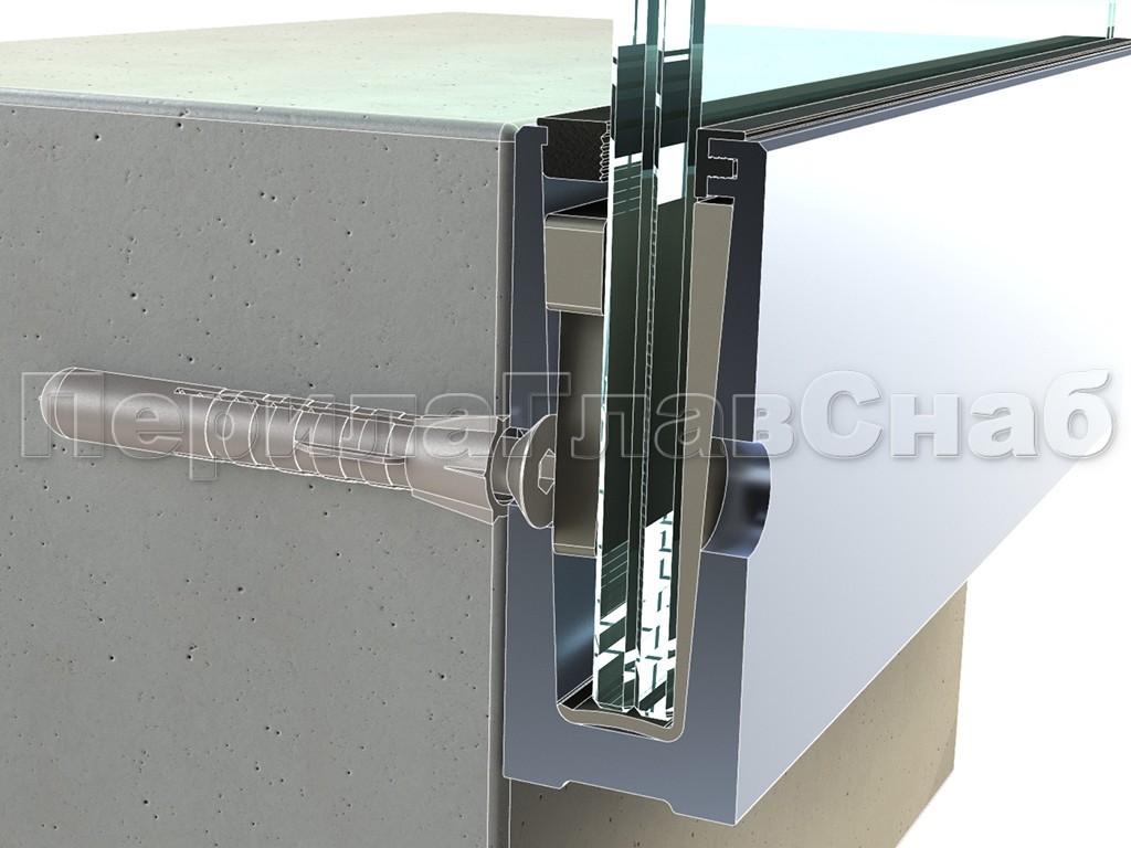 Профиль крепится на горизонтальную поверхность через отверстия просверленные в нижней части профиля. Также профиль может быть смонтирован к боковой поверхности. Стекло вставляется сверху, зажимается распорными клиньями через уплотнительные резиновые прокладки. монтажный паз профиля закрывается резиновой накладкой. Накладки под любую толщину стекла - от 10мм (5+5) до 16мм (8+8) входят в комплект поставки. Дополнительно можно приобрести декоративные накладки из полированной стали и торцевые заглушки.