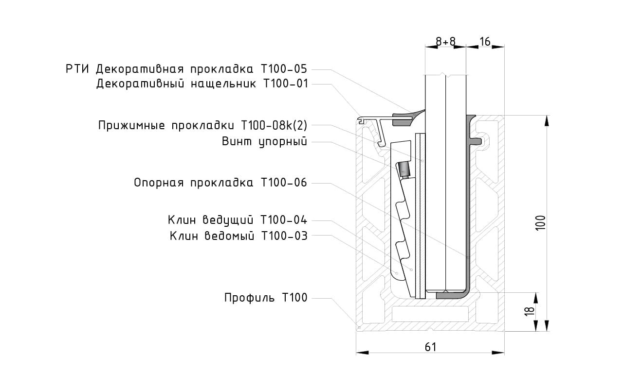 Конструкция данных зажимных систем существенно отличается от существующих на рынке. Основным техническим решением в данных системах — стало увеличение высоты прижимного клина. В аналогичных профилях, что уже существуют на рынке, высота прижимного клина 50-55 мм, тогда как в профиле т100 — 80 мм. Крепежные отверстия гарантирует более удобную и быструю установку профиля на объекте, это уменьшает время и затраты на монтаж.
