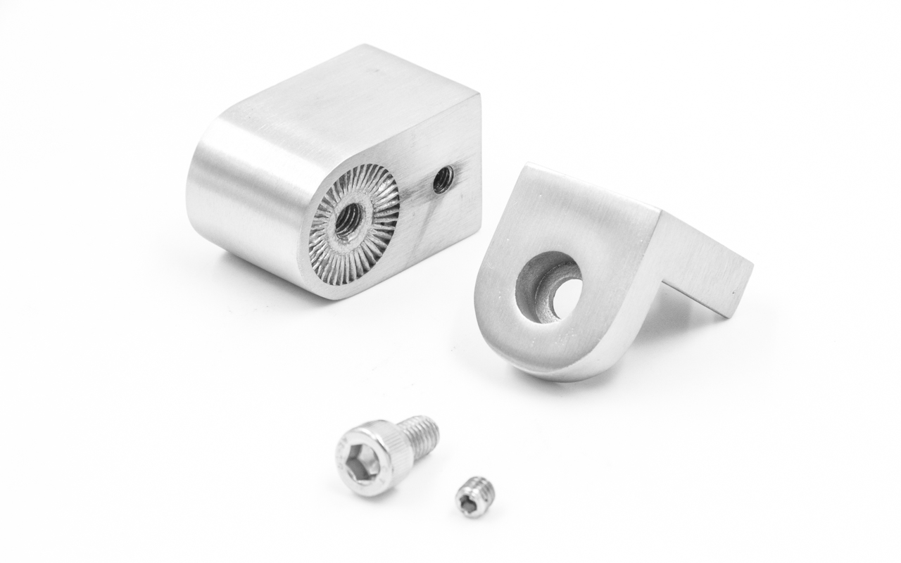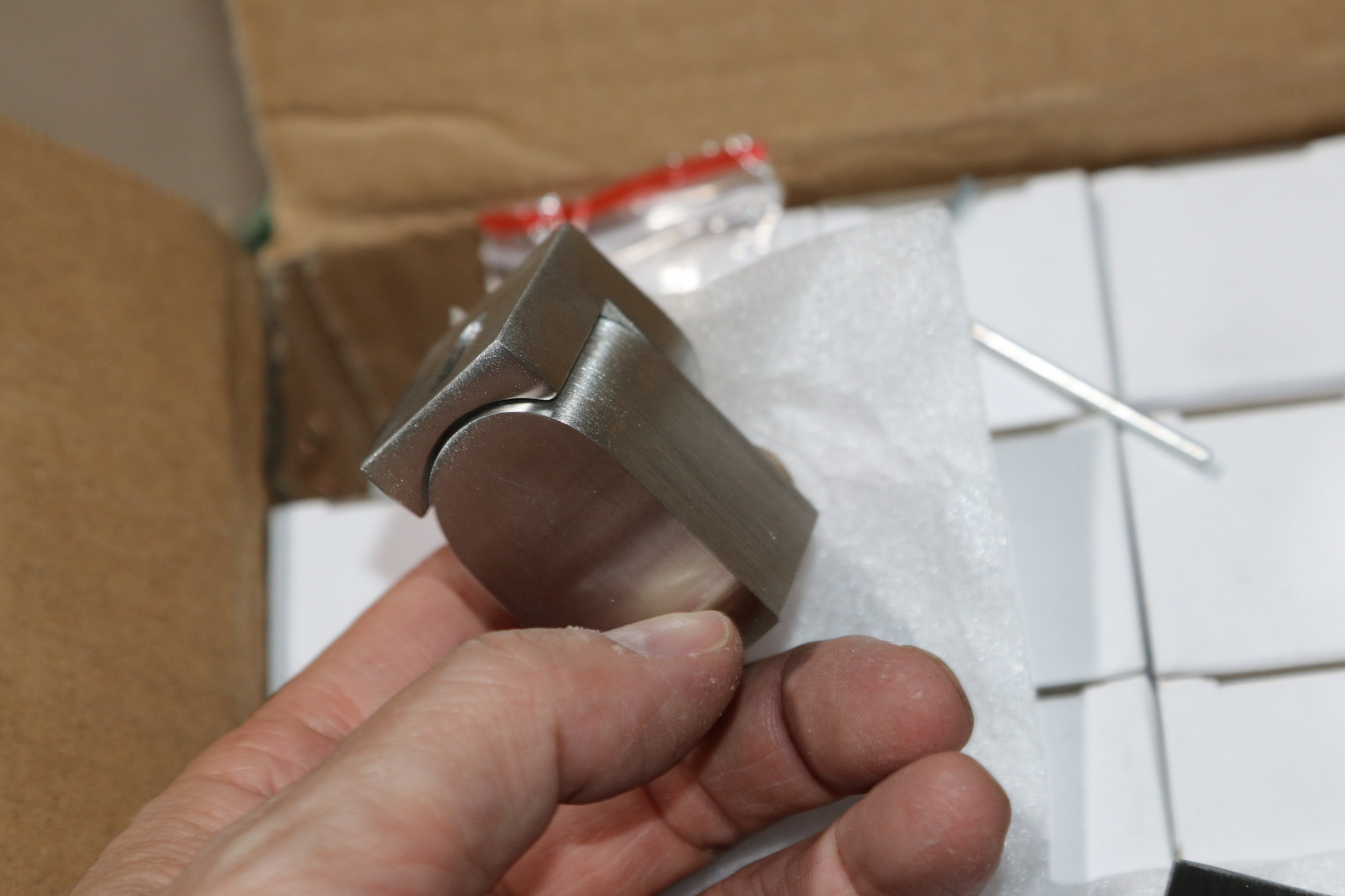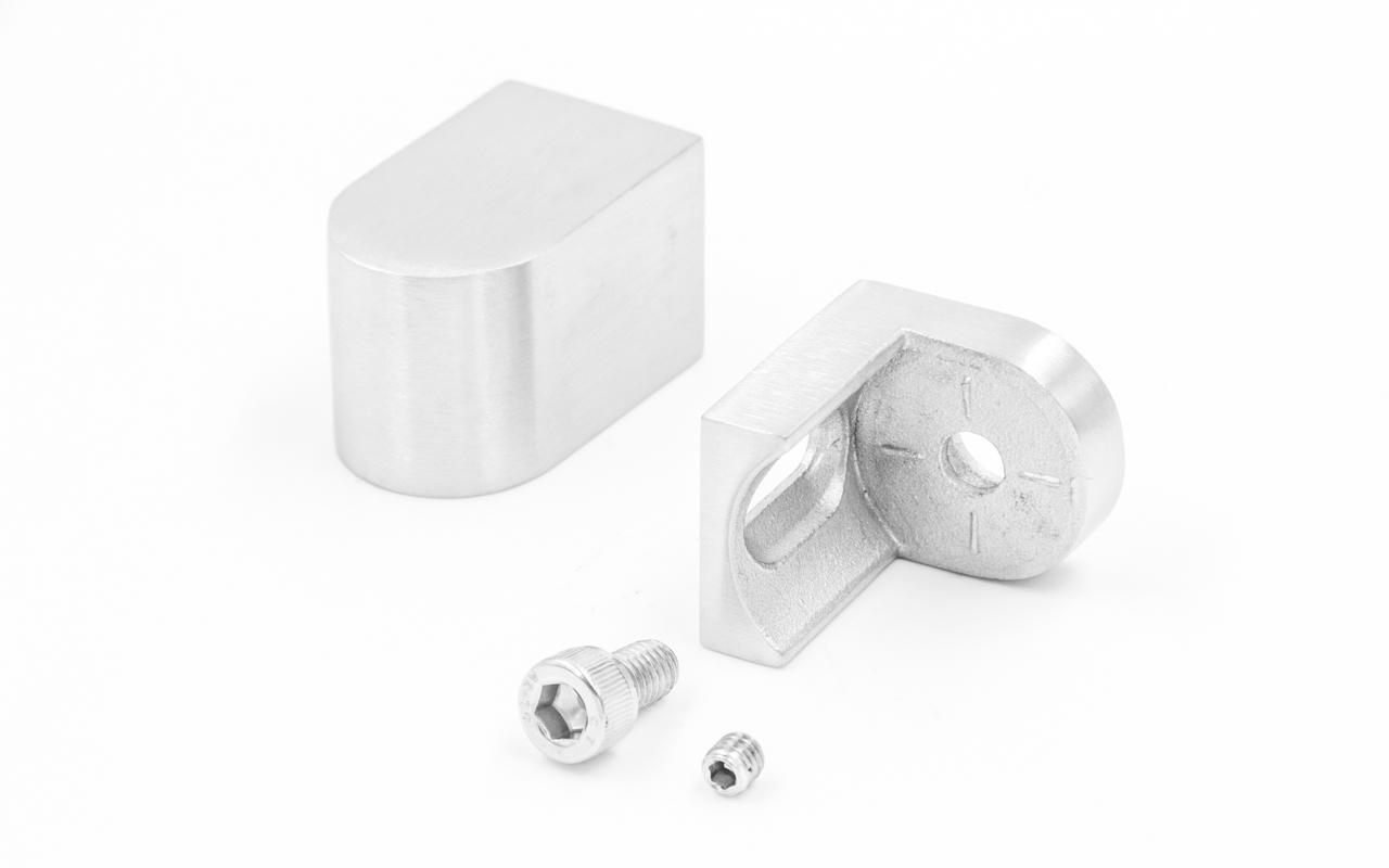 откручиваем центральный винт. Пятку крепим к стене с помощью самореза и дюбеля, вторую часть надеваем на трубу и шестигранником фиксируем трубу. Закручиваем центральный винт- соединяем две половины держателя.