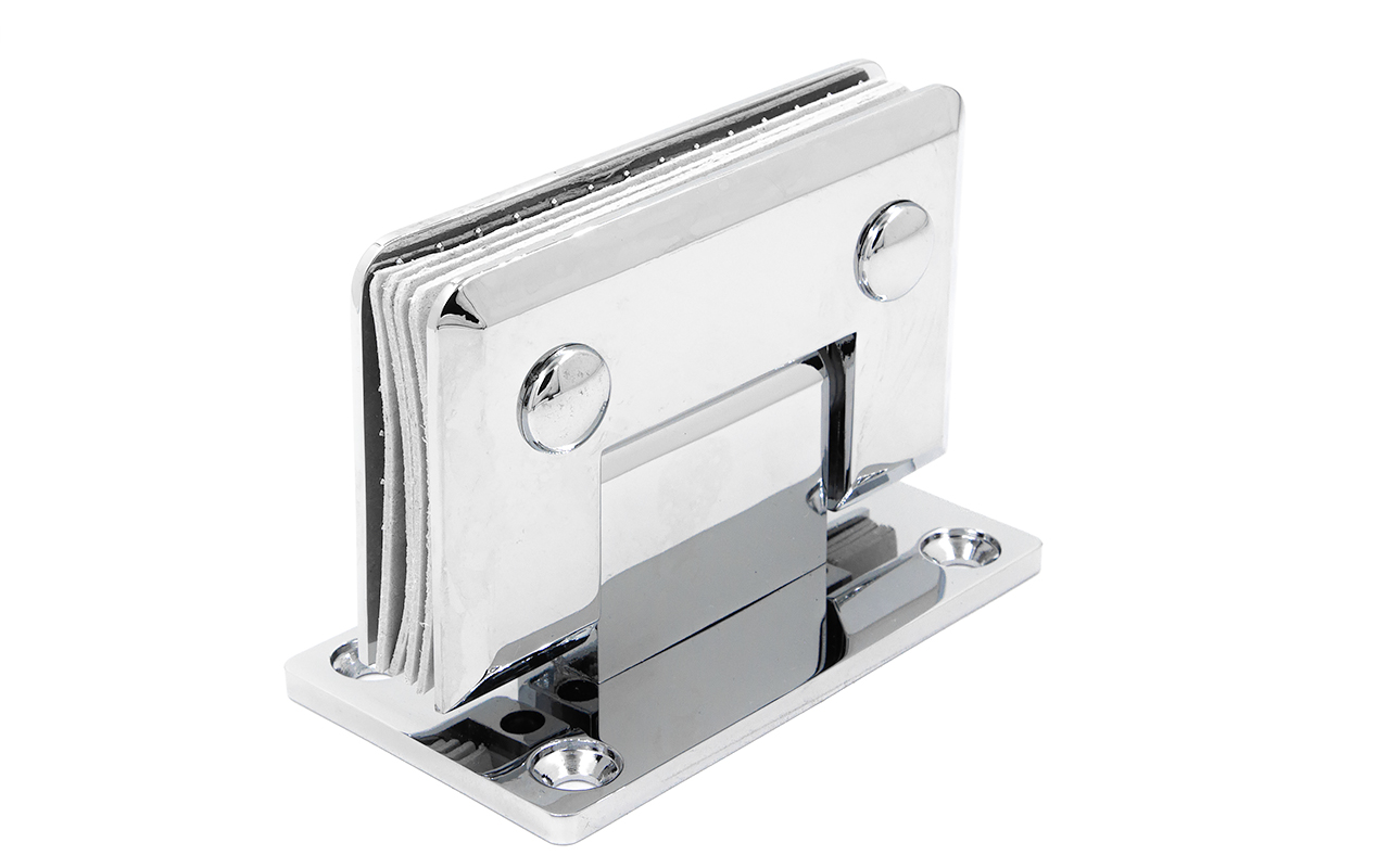 Петля стена-стекло для соединения стеклянной двери душевой кабины со стеной ванной комнаты. Двухстороннее крепление позволяет устойчиво закрепить петлю на стене и уверенно открывать и закрывать дверь в обе стороны. Максимальный угол разведения стыковочных элементов в плане составляет 90°. Масса двери может составлять 35 кг на две петли.