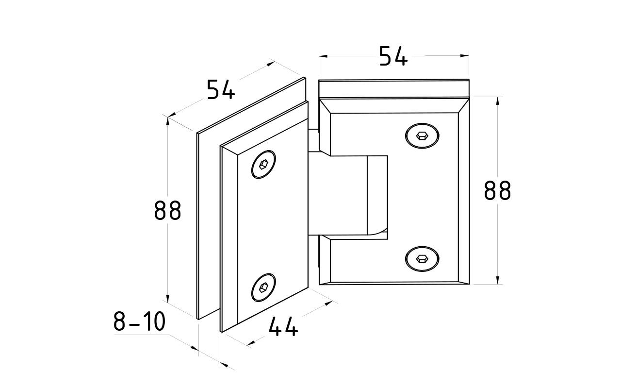 Крепление предусмотрено с двух сторон на 4 винта со шляпками заподлицо (по 2 винта на каждую сторону). Размер одной стороны петли составляет 90х55 мм. Петля стекло-стекло крепится с обеих сторон на стеклянные поверхности, плотно прижимаясь к ним своими металлическими зажимами.