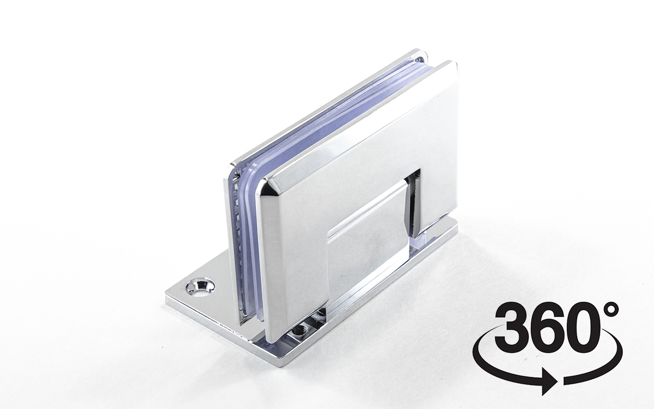Петля из латуни с полированной поверхностью из хрома предназначена для стыковки между собой конструкционных элементов из стекла, толщина которых находится в диапазоне от 8 до 10 мм. Имеет фланец, со смещением, который при монтаже направляется в сторону душа, в результате чего становится не виден с внешней стороны. Также используется для крепления стеклянной двери к краю стены, продолжая её тем самым визуально. В ней реализована функция самозакрытия и поворота в обе стороны. Петля стекло-стекло крепится с обеих сторон на стеклянные поверхности, плотно прижимаясь к ним своими металлическими зажимами. Максимальный вес двери на 2 петли составляет 45 кг. Имеет функцию доводчика до закрытия от 25°. Максимальный угол разведения стыковочных элементов в плане составляет 90°. Крепление предусмотрено на 5 винтов. Размер одной стороны петли составляет 90х55 мм.