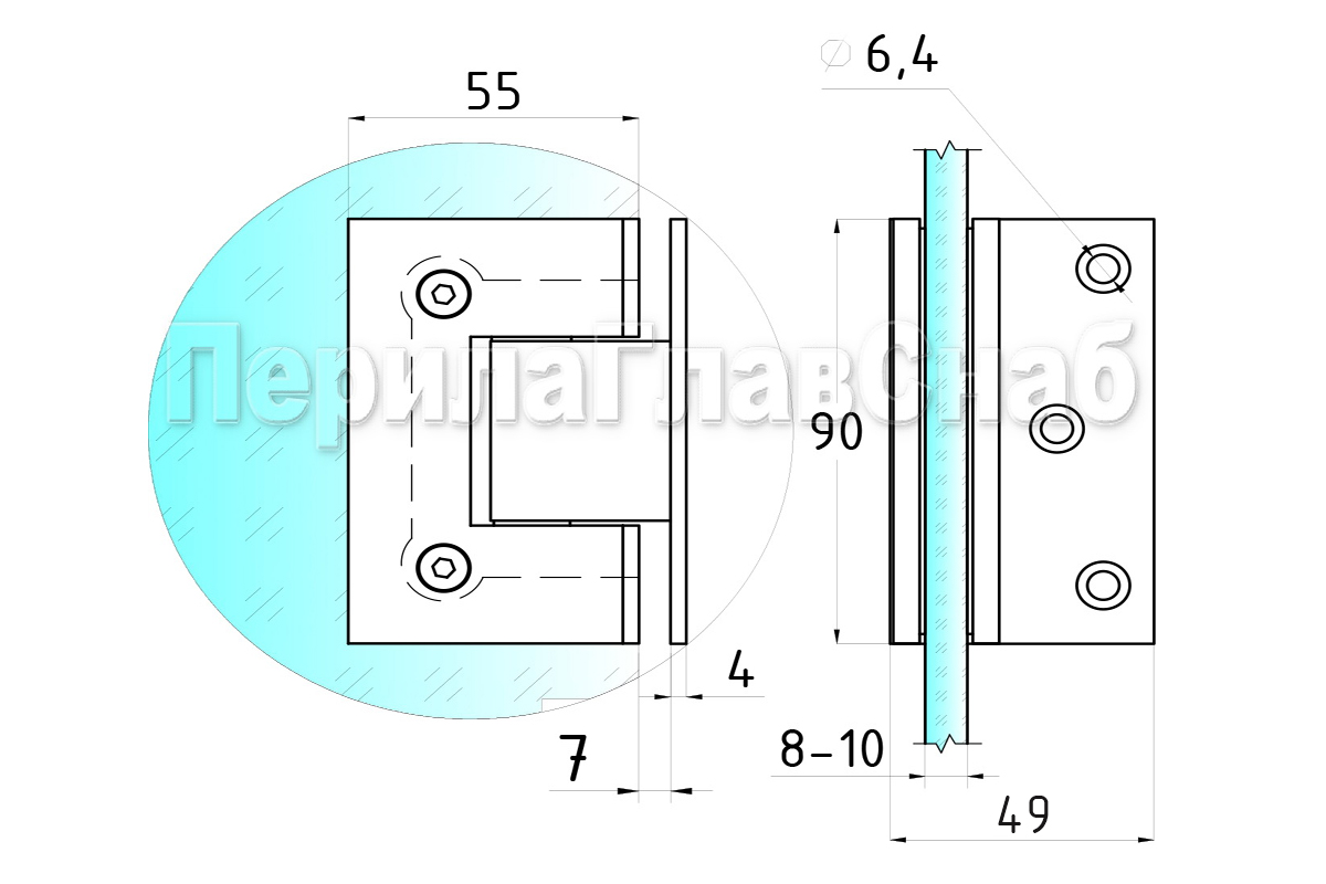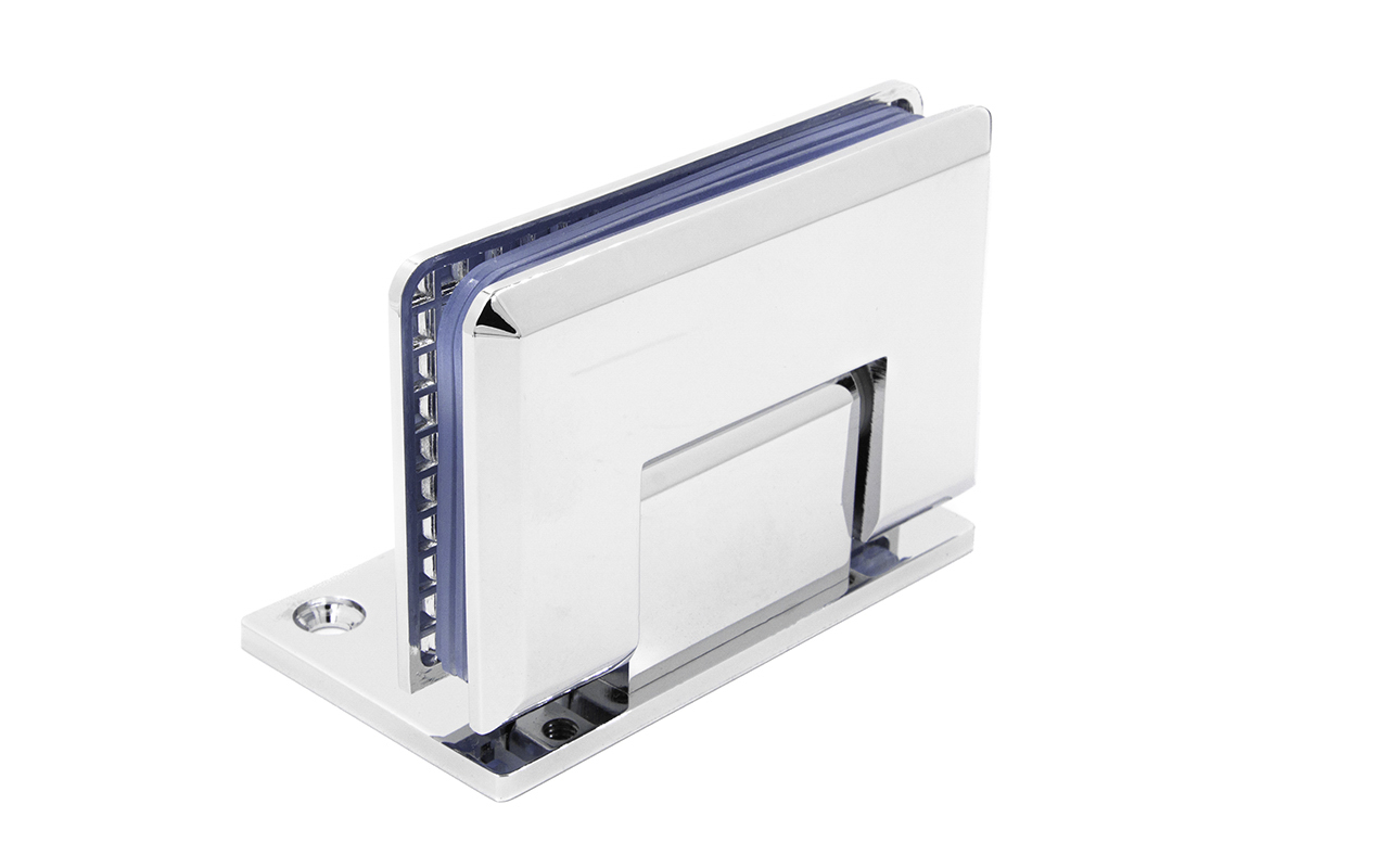 Петля из латуни с полированной поверхностью из хрома предназначена для стыковки между собой конструкционных элементов из стекла, толщина которых находится в диапазоне от 8 до 10 мм. Имеет фланец, со смещением, который при монтаже направляется в сторону душа, в результате чего становится не виден с внешней стороны. Также используется для крепления стеклянной двери к краю стены, продолжая её тем самым визуально. В ней реализована функция самозакрытия и поворота в обе стороны. Петля стекло-стекло крепится с обеих сторон на стеклянные поверхности, плотно прижимаясь к ним своими металлическими зажимами. Максимальный вес двери на 2 петли составляет 45 кг. Имеет функцию доводчика до закрытия от 25°. Максимальный угол разведения стыковочных элементов в плане составляет 90°. Крепление предусмотрено на 5 винтов. Размер одной стороны петли составляет 90х55 мм.