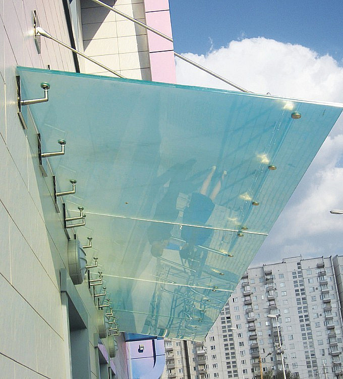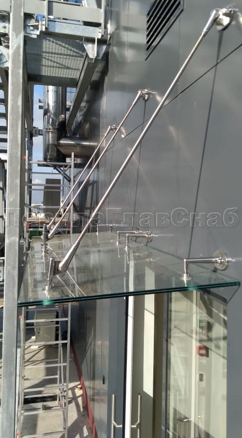• Исключает возможность излома стекла. Конструкция фланца надёжно защищает конструкцию козырька от колебательных нагрузок.