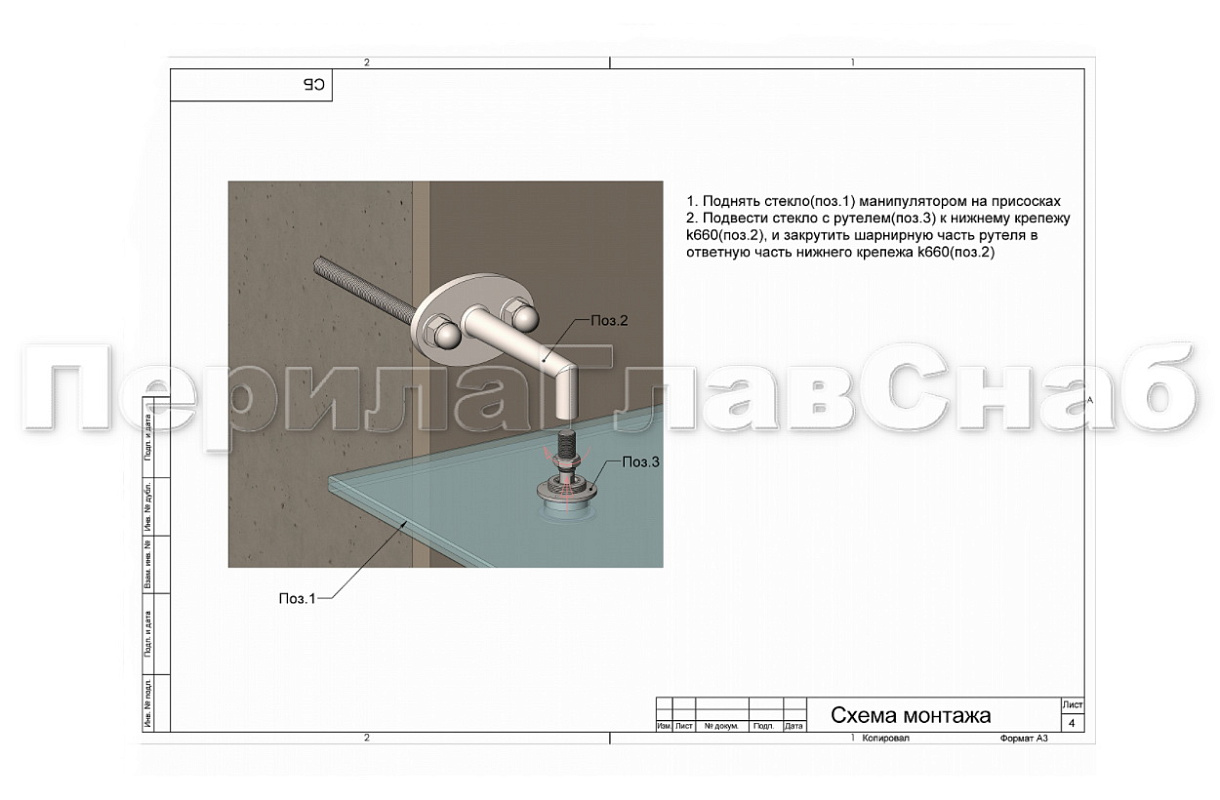 Держатель крепится к стене посредством шпильки. Затем в дистансер держателя вкручивается рутель (предпочтительно k269-6) и уже на рутель крепится стекло.