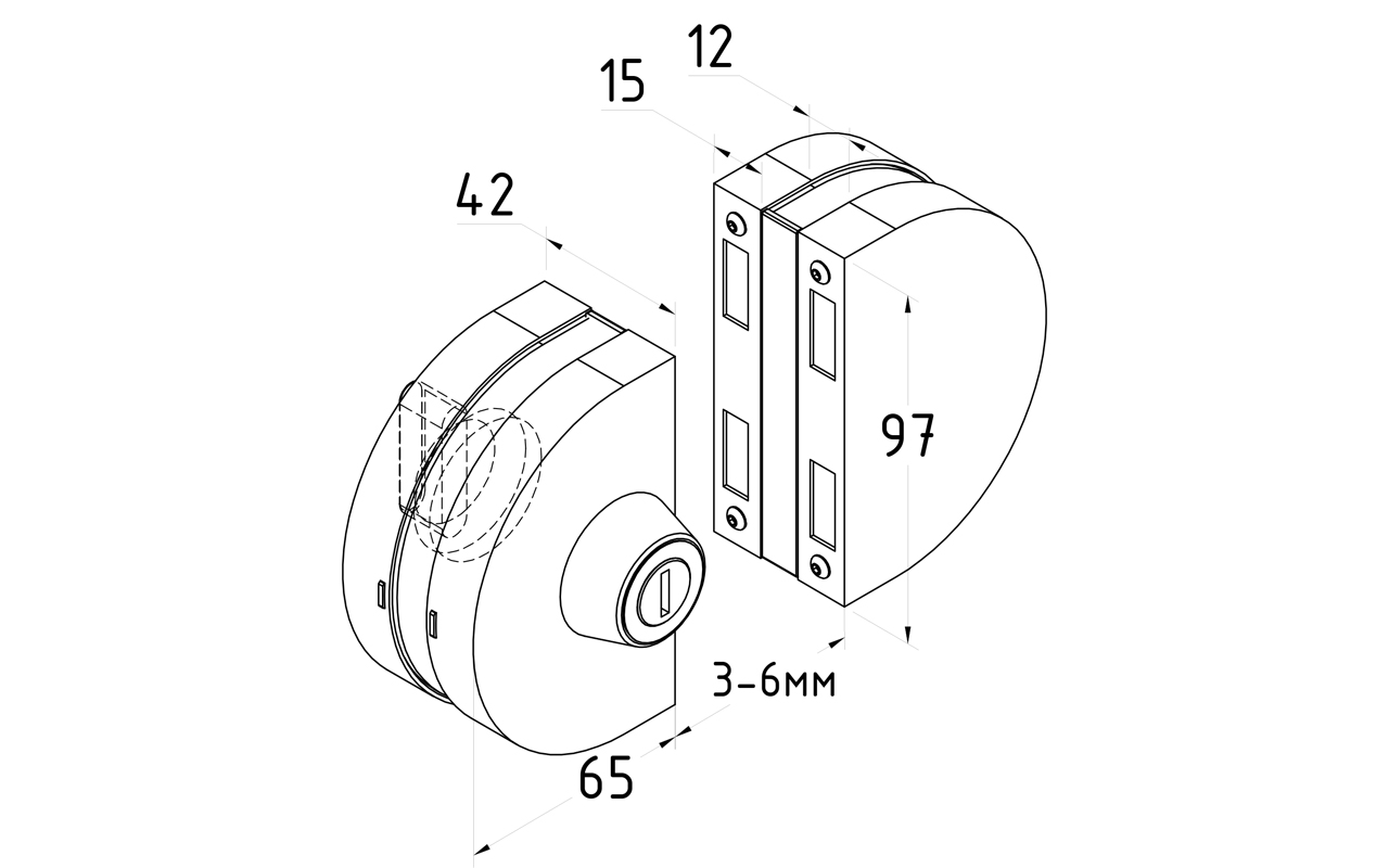замок для раздвижных дверей, с ответной частью на стекло устанавливается без вырезов в стекле, таким образом, его можно поставить уже после монтажа раздвижных дверей.