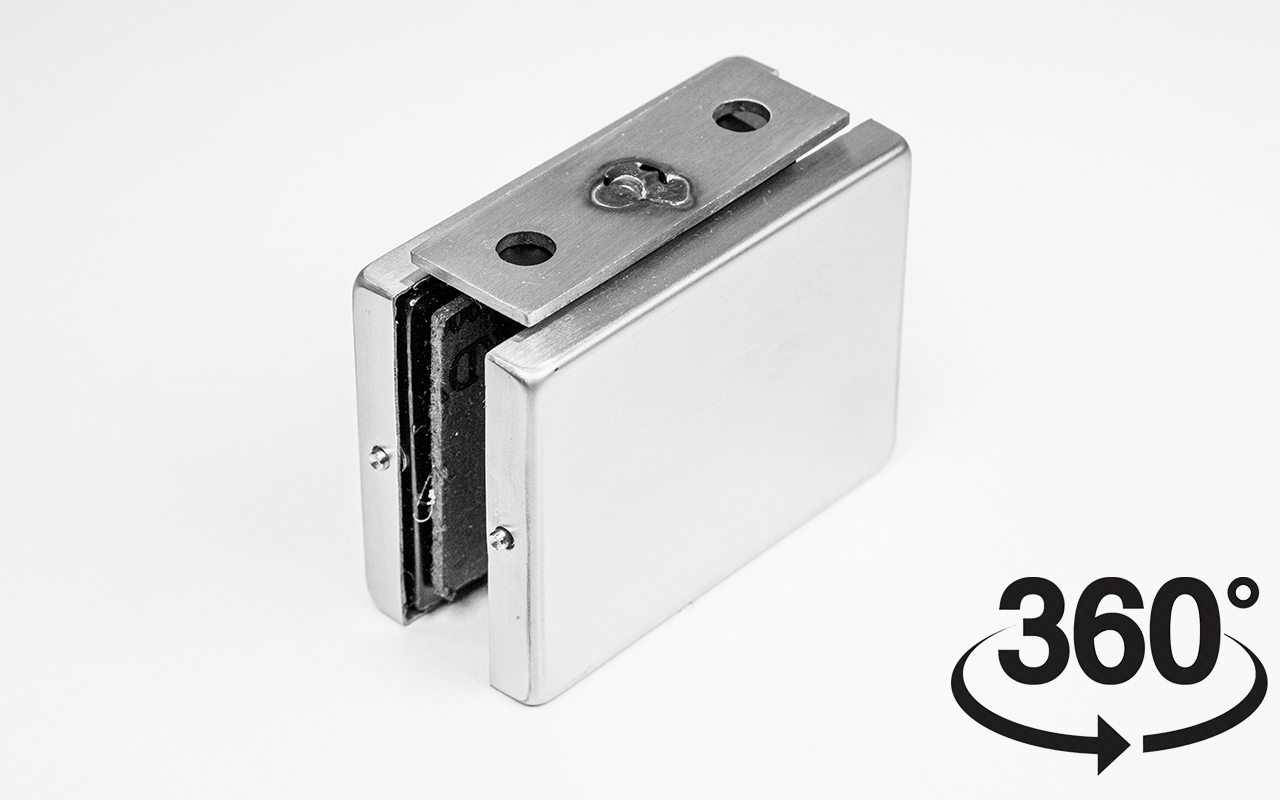 Коннектор разбирается на две половинки, основание металлической пластины крепится к стене на саморезы. Затем к нему прикладывается стекло со специальными полукруглыми вырезами, а далее второй половинкой стекло зажимается.