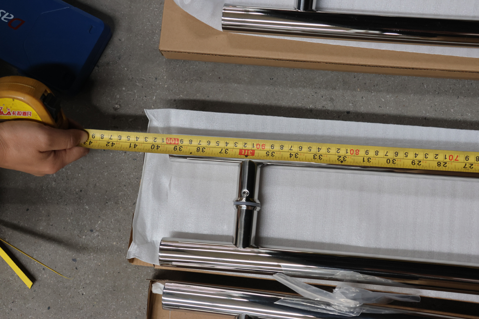 у основания ручки откручиваем с помощью шестигранника винты, делим ручку на две части, в заранее заготовленные отверстия вырезы в стекле 10-12 мм фиксируем первую часть ручки в отверстиях и с обратной стороны ответную часть затягиваем с помощью шестигранника