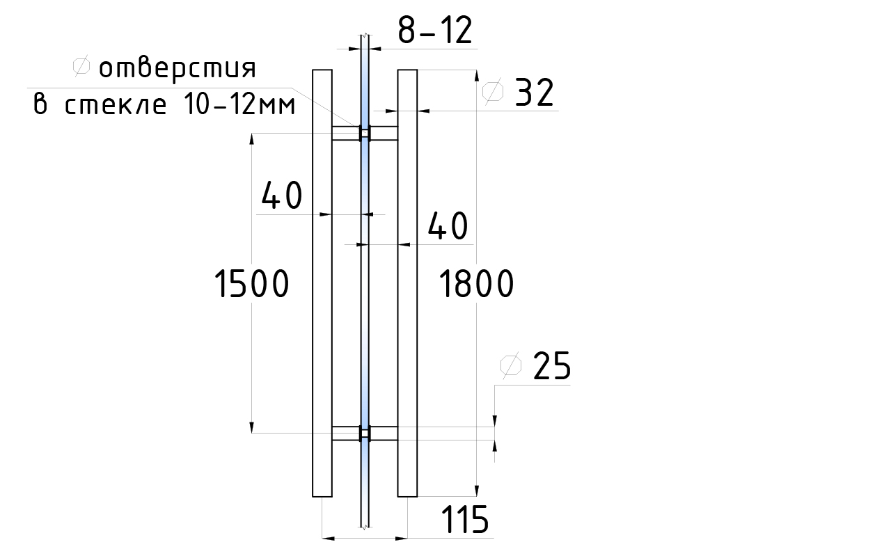 Ручка для стеклянной двери рейлинг двухсторонняя для стекла 8-12 мм, 32х1500х1800 мм, шлифованная. Марка стали-AISI 304
