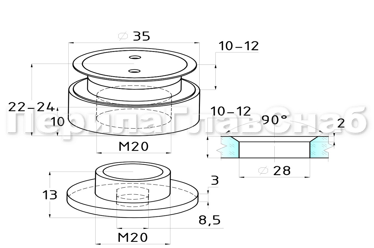 точечное крепление регулируемое 12.5-14.5 мм, под зенковку, для стекла 10-12 мм, шлифованное. Точечный стеклодержатель для стеклянных стен. Вылет от стены 12.5-14.5 мм, для крепления используется шпилька М8