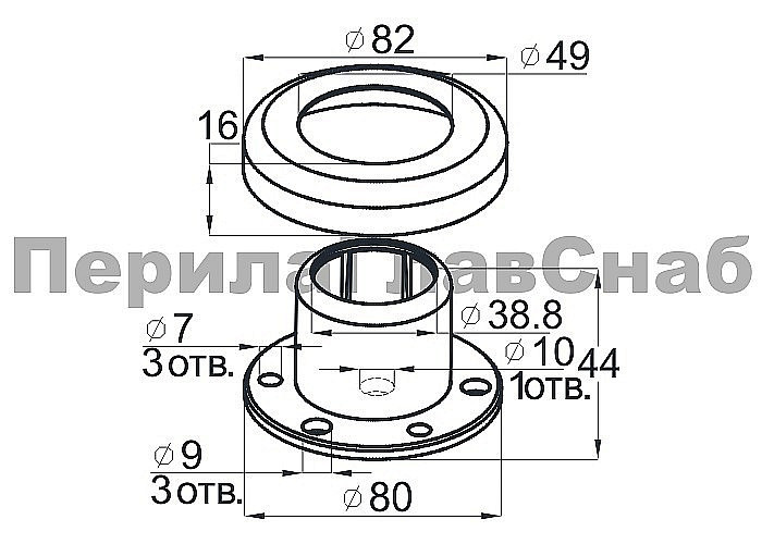 Фланец стойки 42.4/80 х 5 (4,3) х AISI 304 #200 3 отв х М10 х 20 k116-42-4