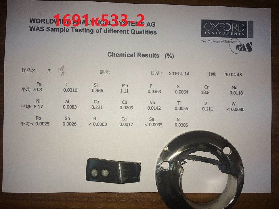Фланец штампованный с тремя отверстиями, внешний. Диаметр 68 мм, полированный. Деталь для трубы диаметром 38.1 мм, толщина 1.3 мм. Марка стали - AISI 304
