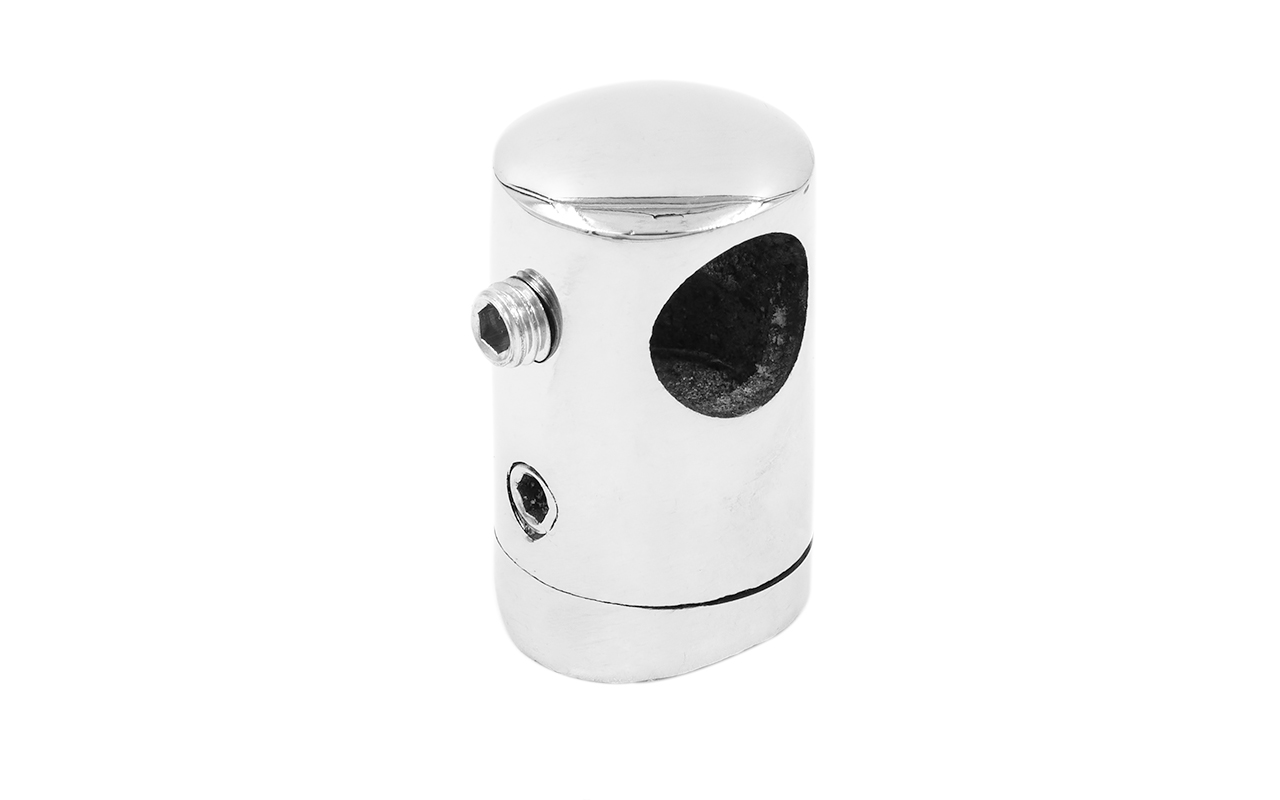 Ригеледержатель k082, разборный, под трубу Ø38.1 мм и ригель (леер) - 10 мм, ригель крепится сквозь отверстие 10.5 мм, шурупом под шестигранник. Деталь полированная, с изменяемым углом прокладки ригеля.