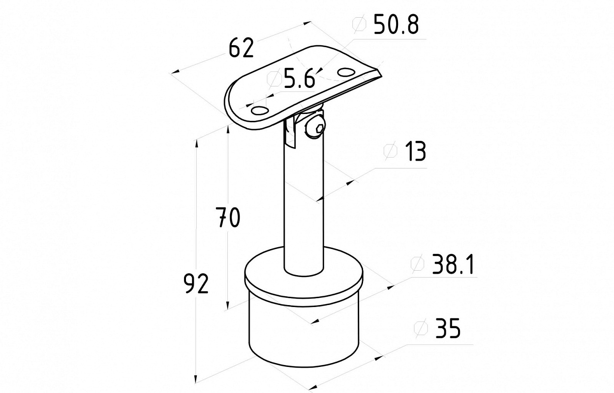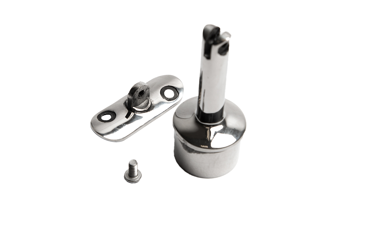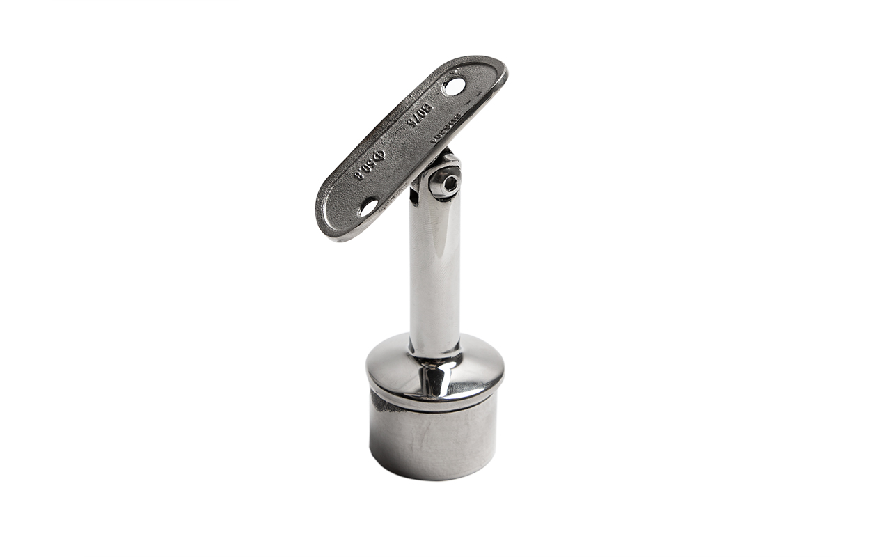 Предназначен для стойки Ø38.1 мм (k819, k849) под поручень Ø38,1-42,4 мм. Деталь с регулируемым ложементом и отверстиями под саморезы. Можно крепить как на сварку, так и на специальный клей ( , ). На сегодняшний день это наиболее распространенный тип наконечников стоек, повсеместно используемый в монтаже ограждений.