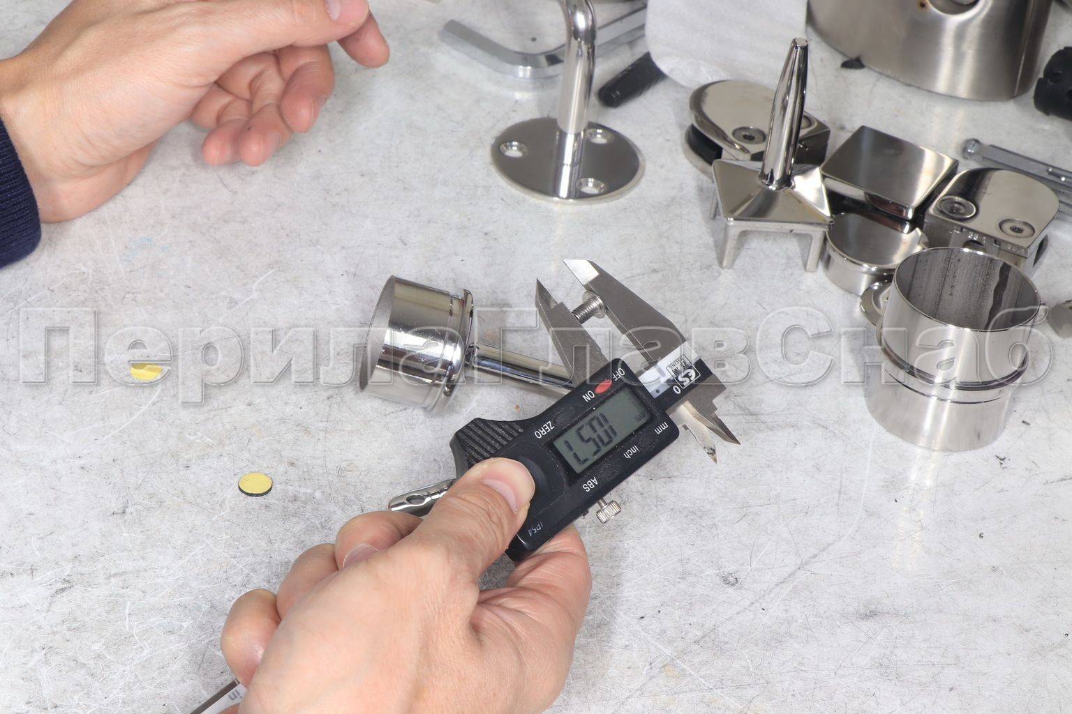 Наконечник палец на стойку Ø42.4х1.5 мм, с регулируемым ложементом под поручень Ø50.8 мм. Деталь литая, полированная, с повышенной коррозионной стойкости, нержавеющая. Марка стали - AISI 316