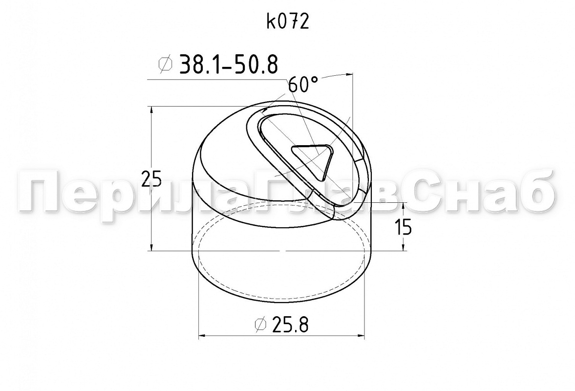 Наконечник штампованный (СПС) прямой 90° на трубу Ø25 мм, для поручня Ø38.1 мм, полированный, нержавеющий, AISI 304, k071