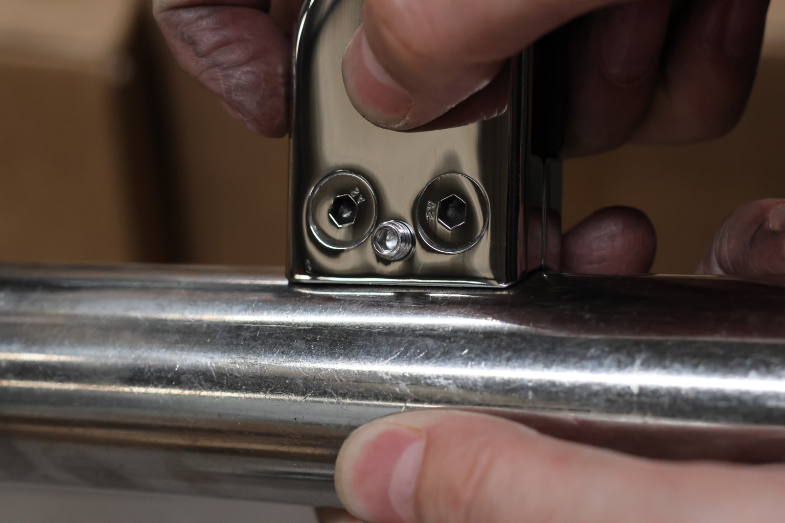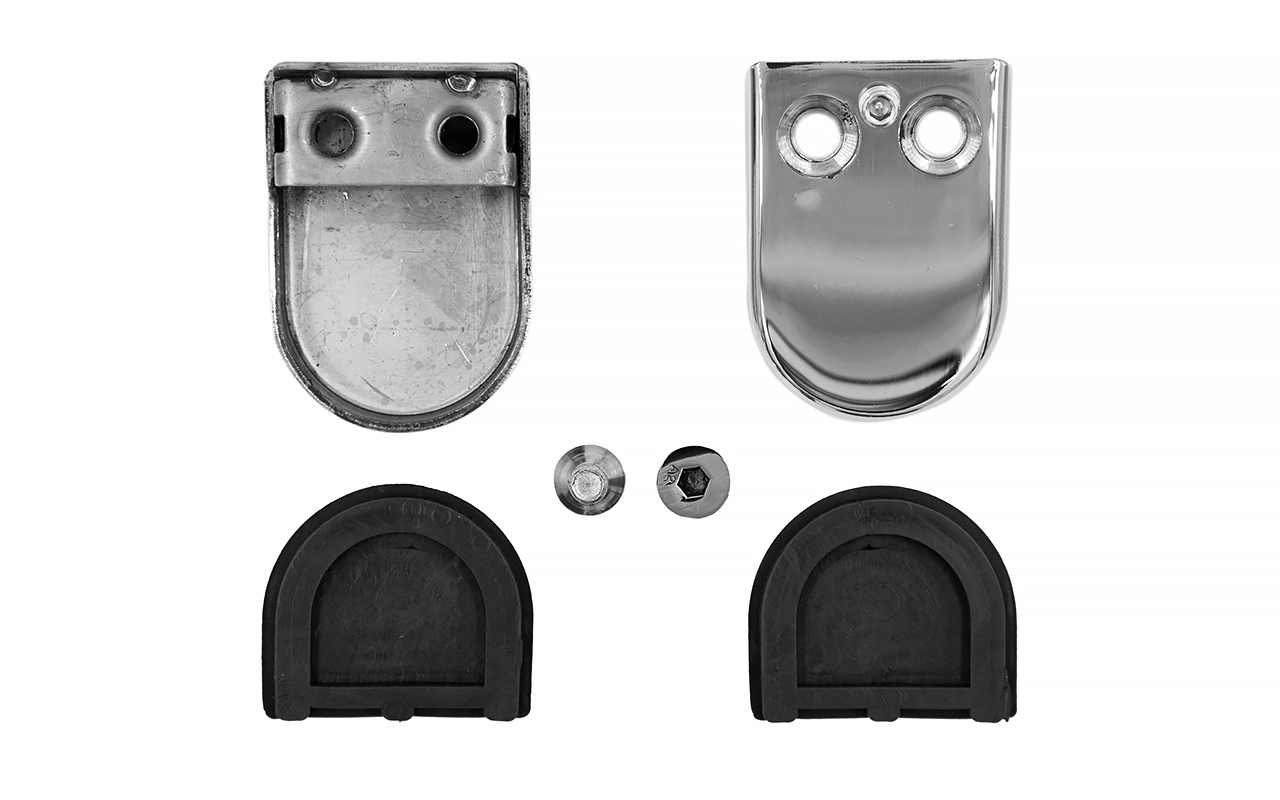 2. Либо вваривают шпильку с резьбой М6 и закрепляют первую половину стеклодержателя на стойке, стягивая гайкой. Вторая часть стеклодержателя присоединяется к первой входящими в комплект специальными винтами под шестигранный ключ. В этот момент стекло зажимается между двумя половинками детали специальными высокотехнологичными уплотнителями из EPDM.