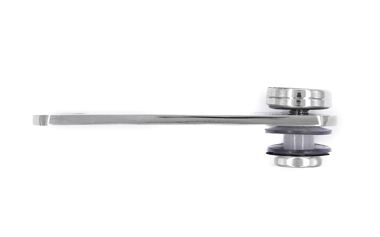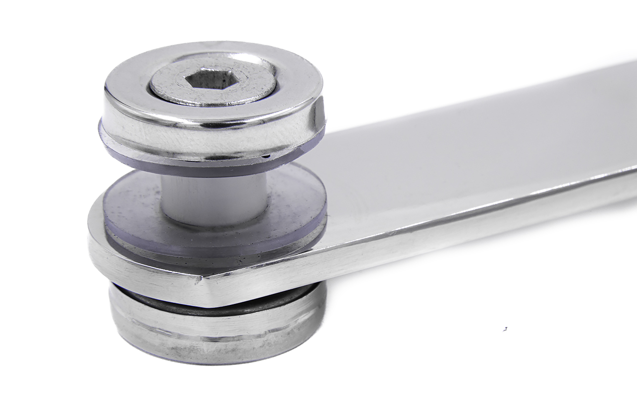Стеклодержатель пластинчатый 2хМ8 (половинка), по центрам 85х5 мм, полированный, шайбы 5 мм штамп., под стекло 6-12 мм, (AISI 304) k023-1/2