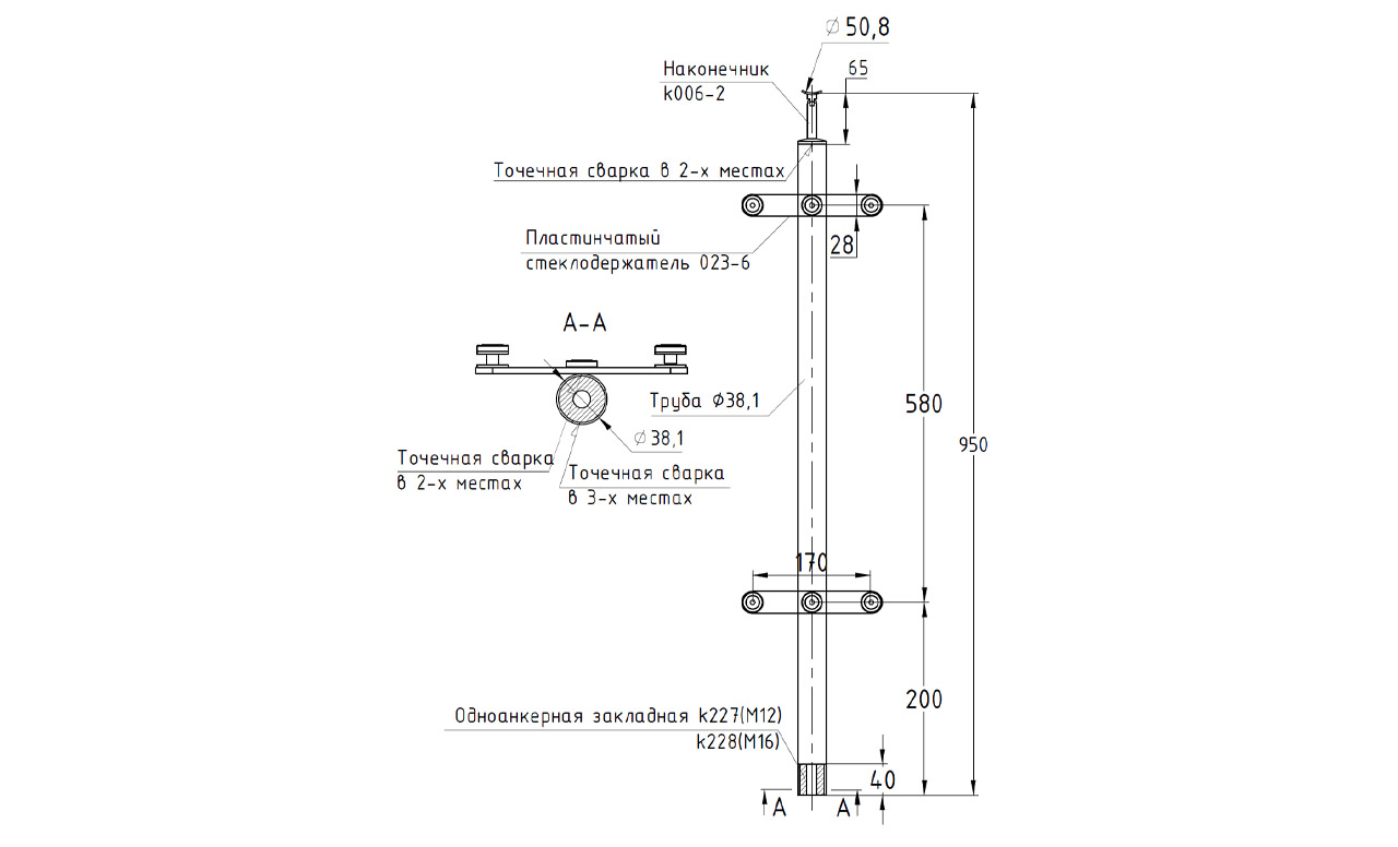 Стойка круглая Ø38.1: 2 пластинчатых стеклодержателя, полированная, с одноанкерым крепежом, высота 950 мм (AISI 304) k739