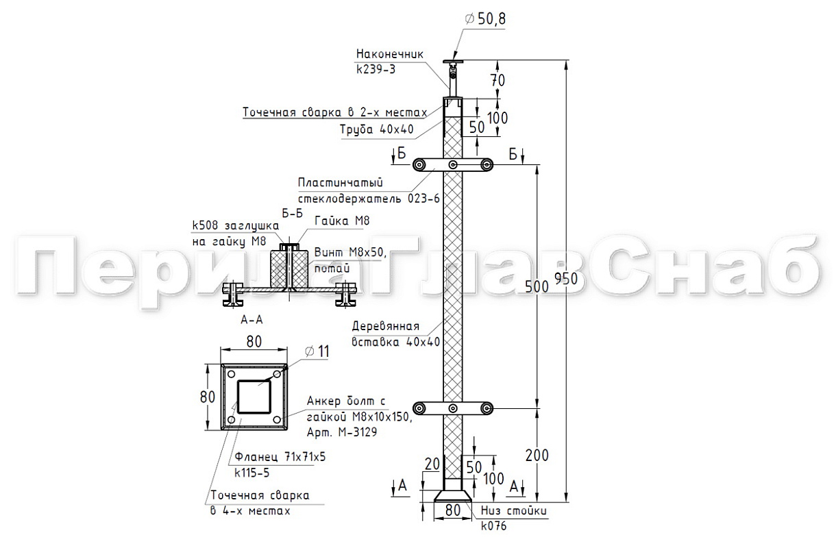 Готовая стойка 40х40х950 мм, деревянная, со вставками из нержавеющей стали 2х100 мм с 2 зажимными стеклодержателями k740-4-L купить в Екатеринбурге