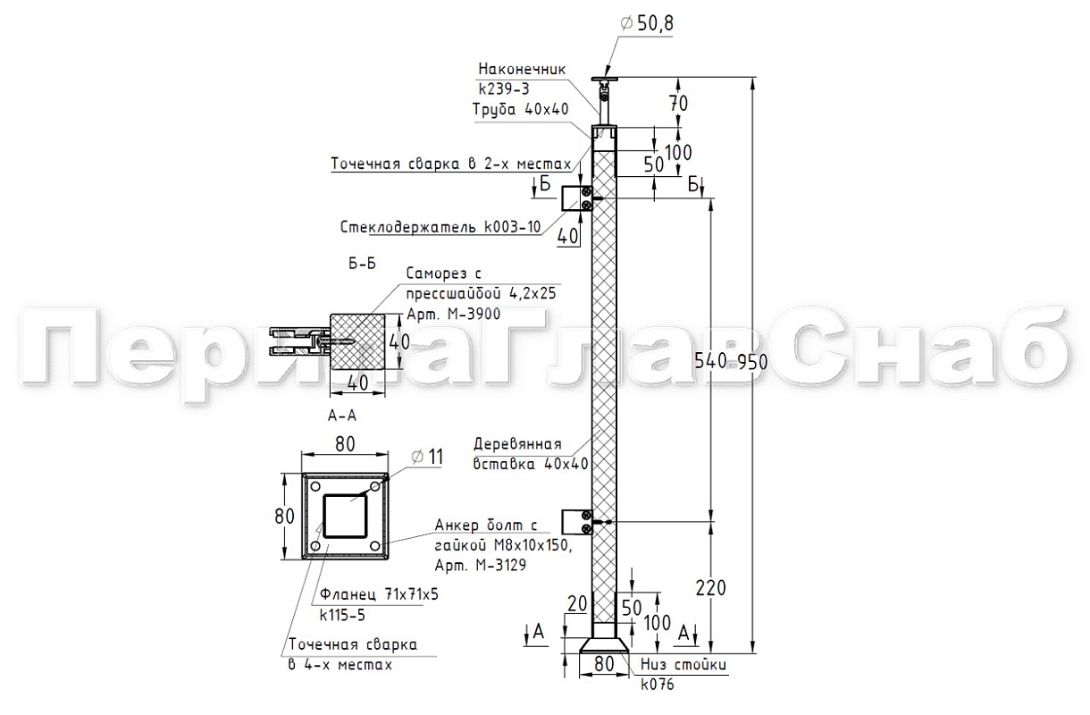 Готовые стойки – это экономия вашего времени и денег. Приобретая готовую стойку Вы можете собрать ограждение сами, не привлекая монтажную бригаду и экономя денежные средства на монтаже. Стойка легко монтируется к полу благодаря четыреханкернуму фланцу с отверстиями под анкер-болт М8 ( , , ) или шпильку ( ; ) в комплекте с хим анкером или , а крепеж скрывает декоративная крышка идущая в комплекте стойки. Поручень из нержавеющей стали можно закрепить при помощи самореза (, , ), либо при помощи заклепки () и винта М6 (М-3973) что на порядок эффективней, для крепления при помощи заклепок необходимо растачивать отверстие в ложементе. Если вы используете деревянный поручень, то его можно закрепить при помощи саморезов ( , , ). После покраски дубовой проставки подклеиваете клеем ( , ). Ограждение готово!