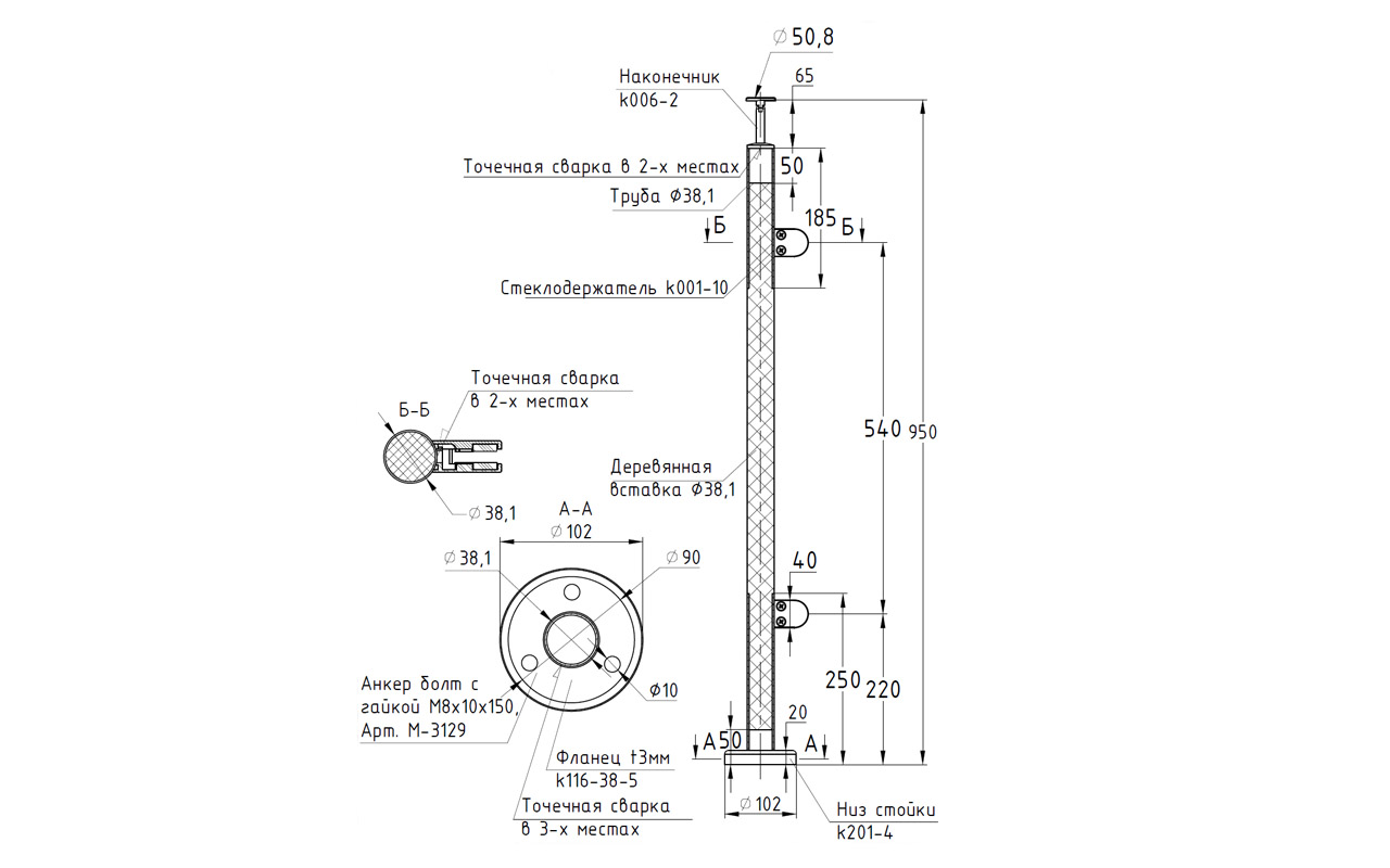 Готовые стойки – это экономия Вашего времени и денег. Приобретая готовую стойку Вы можете собрать ограждение сами, не привлекая монтажную бригаду и экономя денежные средства на монтаже. Стойка легко монтируется к полу благодаря треханкернуму фланцу с отверстиями под анкер-болт М8 ( , , ) или шпильку ( ; ) комплекте с хим анкером Ф-0799 или Ф-0800., а крепеж скрывает декоративная крышка идущая в комплекте стойки. Поручень из нержавеющей стали можно закрепить при помощи самореза ( , , ), либо при помощи заклепки ( ) и винта М6 ( М-3973) что на порядок эффективней, для крепления при помощи заклепок необходимо растачивать отверстие в ложементе. Если вы используете пластиковый ( , , , , , , ) или деревянный поручень, то его можно закрепить при помощи саморезов ( , М-3850, ). После покраски дубовой проставки подклеиваете клеем ( Ф-1127, Ф-1105). Стекло заказывается после установки стоек и снятия размеров. После того, как стекло готово к установке, при помощи шестигранника ( , ) разъединяете стеклодержатель, надеваете стекло и закручиваете обратно. Ограждение готово!