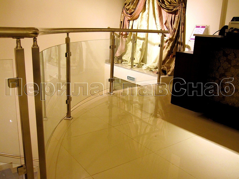 В числе наиболее сложных типов в галерее представлено ограждение с использованием моллированного или как его ещё часто называют «гнутого» стекла по радиусу поручня.