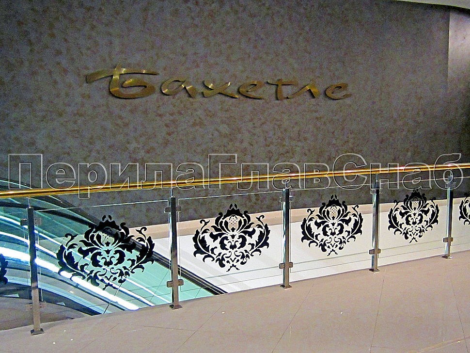 Ограждение со стеклом изготовлено с применением квадратных стоек из полированной нержавеющей стали и стекла с нанесенным логотипом.