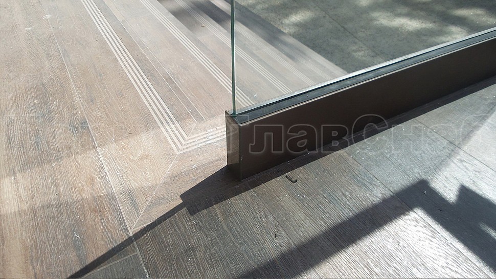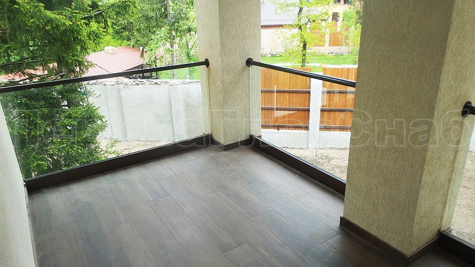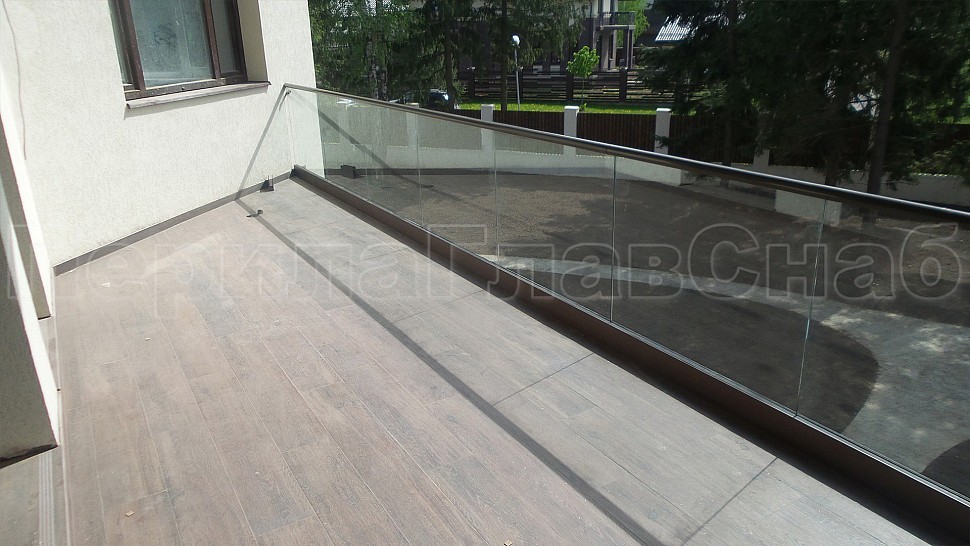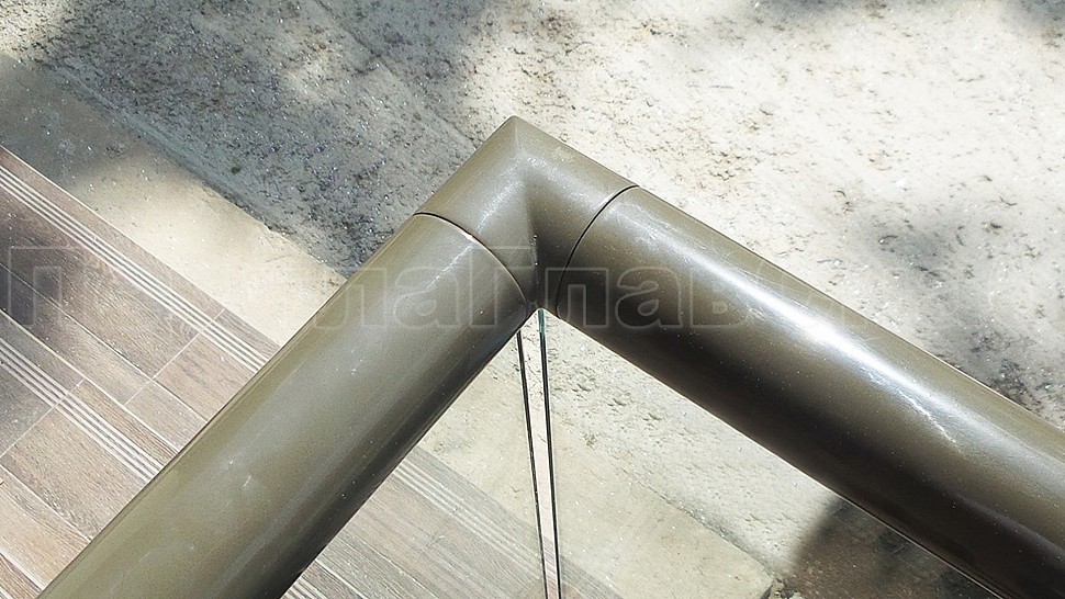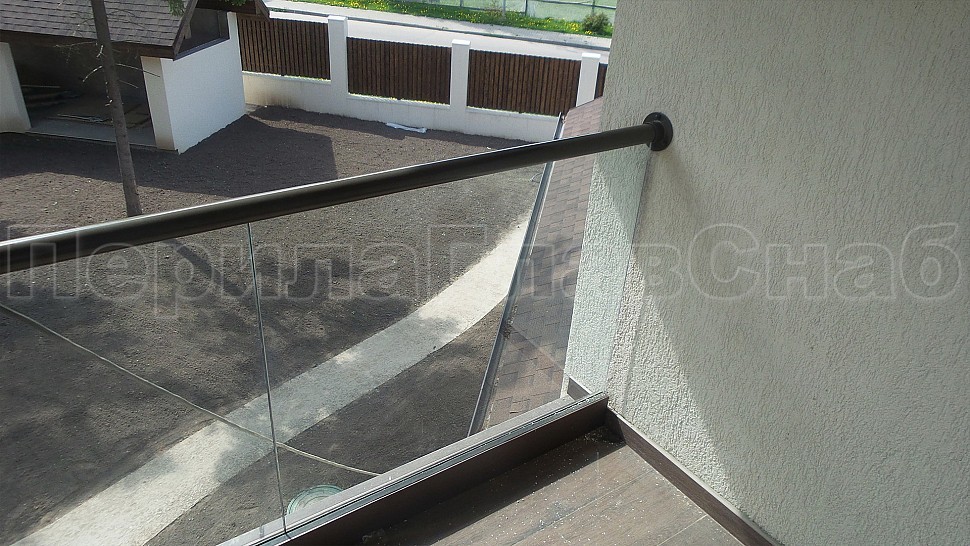 На данном объекте было установлено балконное ограждение высотой 950 мм с каленым прозрачным стеклом 10мм и с поручнем диаметром 50 мм из полированной нержавеющей стали AISI304, окрашенным по цвету анодировки профиля с креплением на стекло через паз. Стекло крепится на алюминиевый зажимной профиль, анодированный в цвет B32 Е6. Поручень завязан на поворотах, окончание фланец с креплением в стену. Крепление нержавеющих элементов ограждения между собой точечная аргонно-дуговая сварка, длина швов 2мм, с последующей зачисткой и полировкой, которые не имеют и намека на коррозию или прочие повреждения.