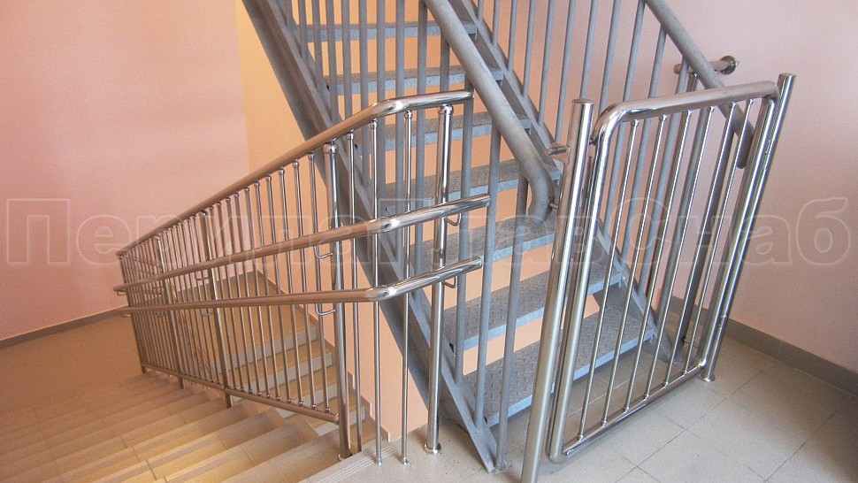 - У лестницы же стойки имеют высоту чуть большую — 950 мм, труба Ø38 мм. Устанавливаются на расстояние через две ступени в третью, на прямых участках не более 1000 мм друг от друга. Наконечник выполнен в декоративном стиле в виде сферы. Для большей безопасности установлены семь ригелей между стойками, и, в отличие от пандуса, они крепятся к стойке сваркой снизу и установлены вертикально. Поручень двойной диаметром 38 мм установлен на высоте 700 мм и 900 мм, крепится к стойке на выносных держателях и на поворотах завязан бубликом.