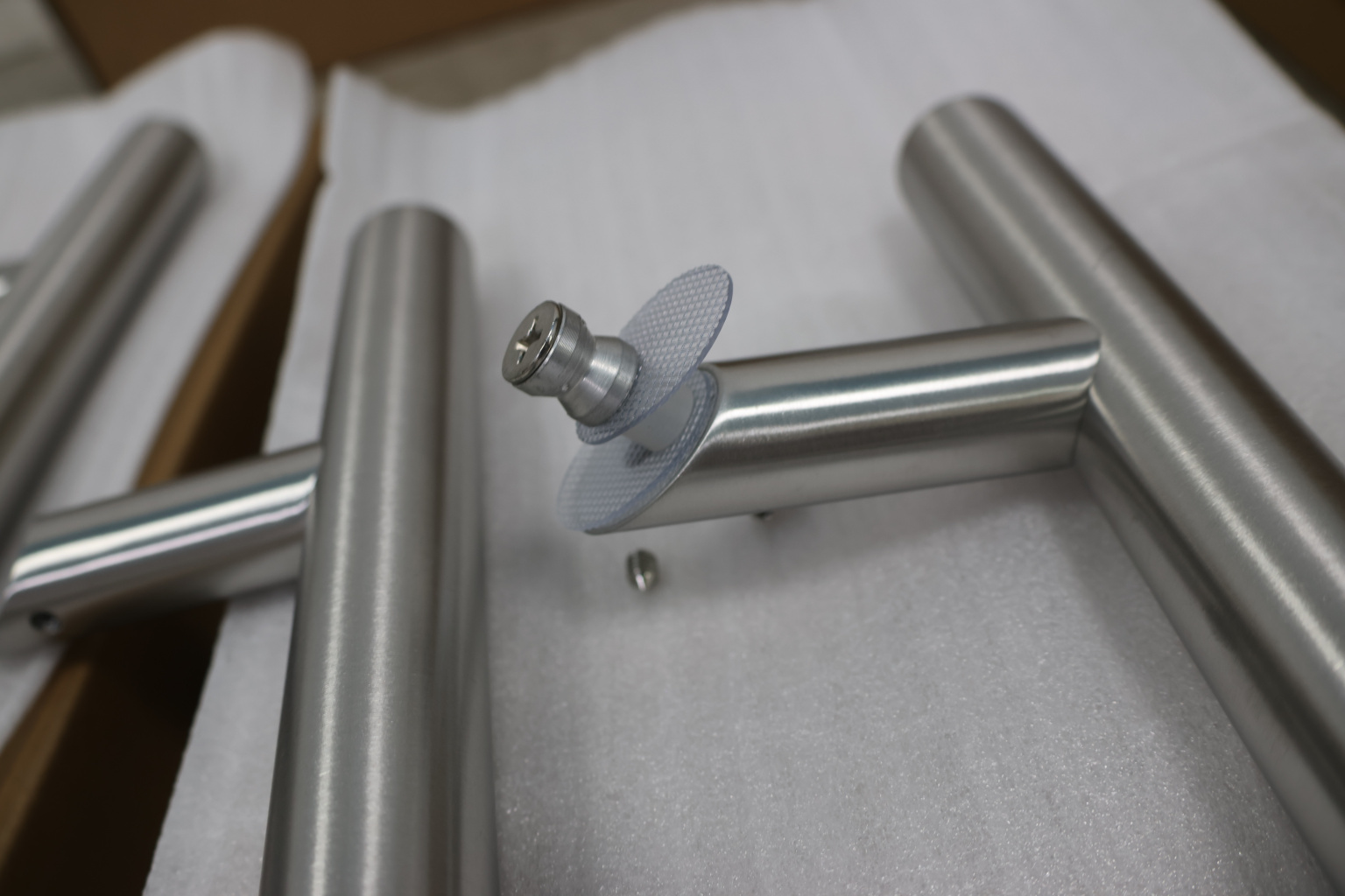у основания ручки откручиваем с помощью шестигранника винты, делим ручку на две части, в заранее заготовленные отверстия вырезы в стекле 10-12 мм фиксируем первую часть ручки в отверстиях и с обратной стороны ответную часть затягиваем с помощью шестигранника