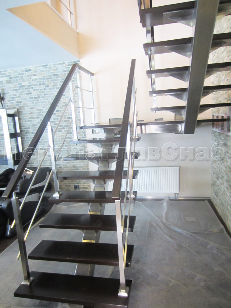 Ограждение лестницы на квадратных стойках с латунным поручнем в Екатеринбурге. Готовые проекты ПерилаГлавСнаб