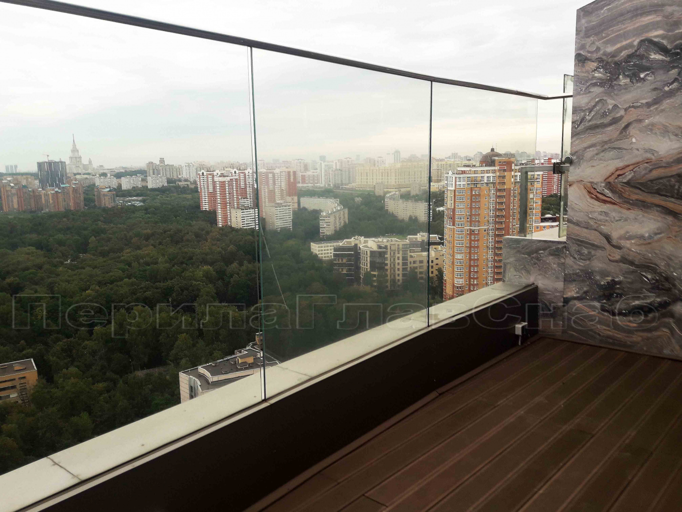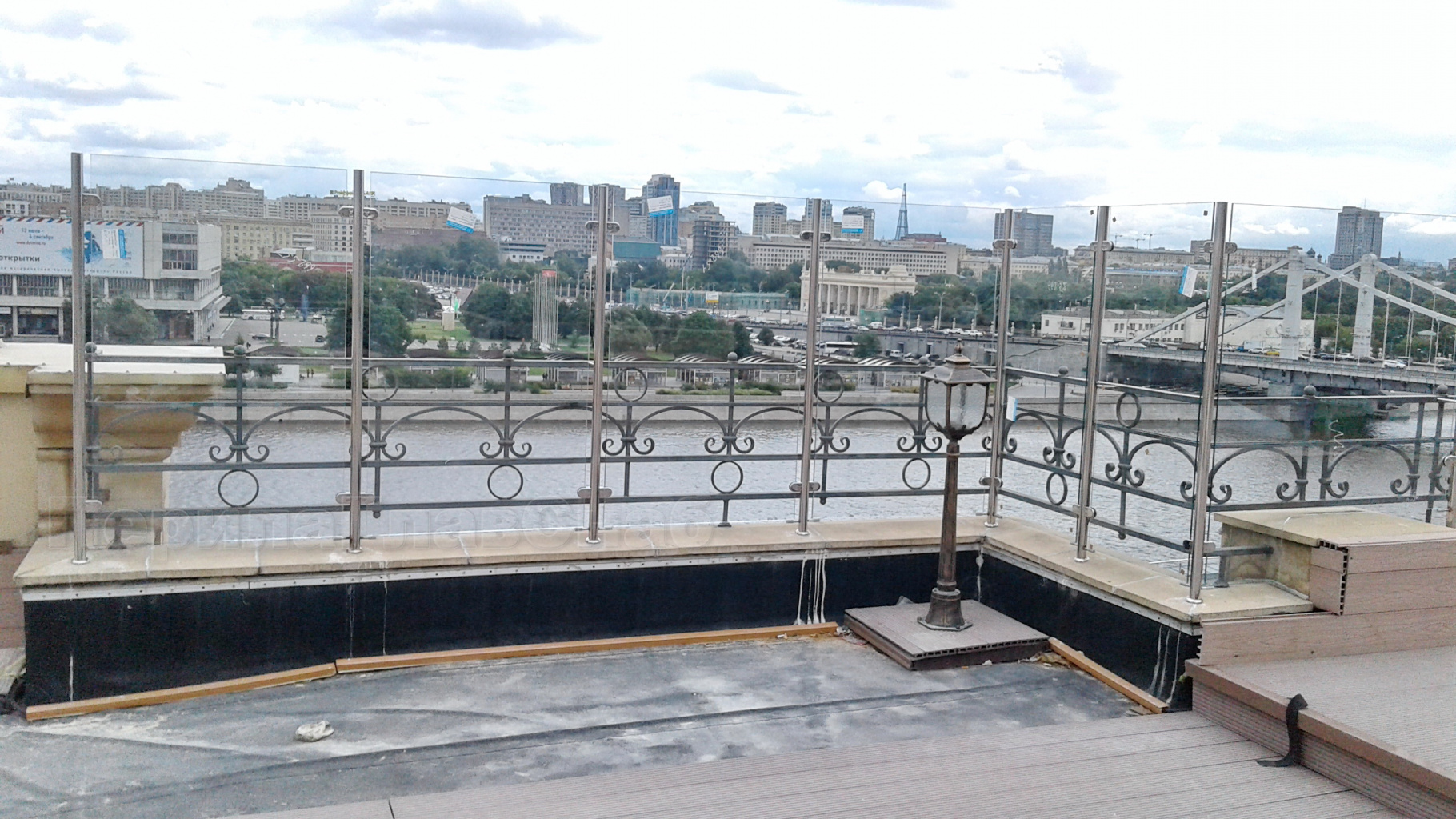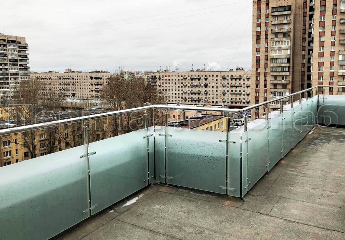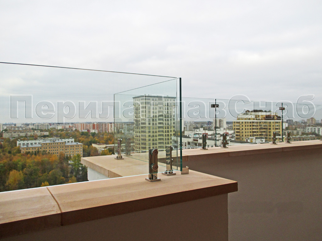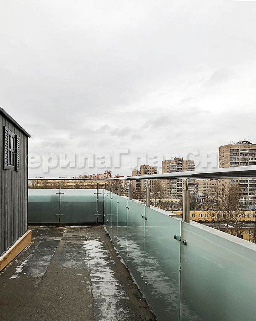 Стеклянные ограждения кровли со стойками на крыше многоэтажного дома. Дешевый аналог.