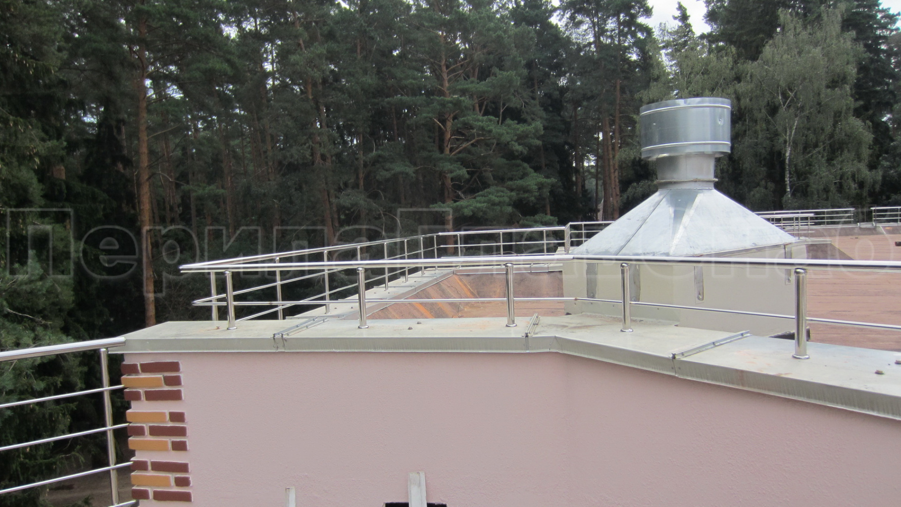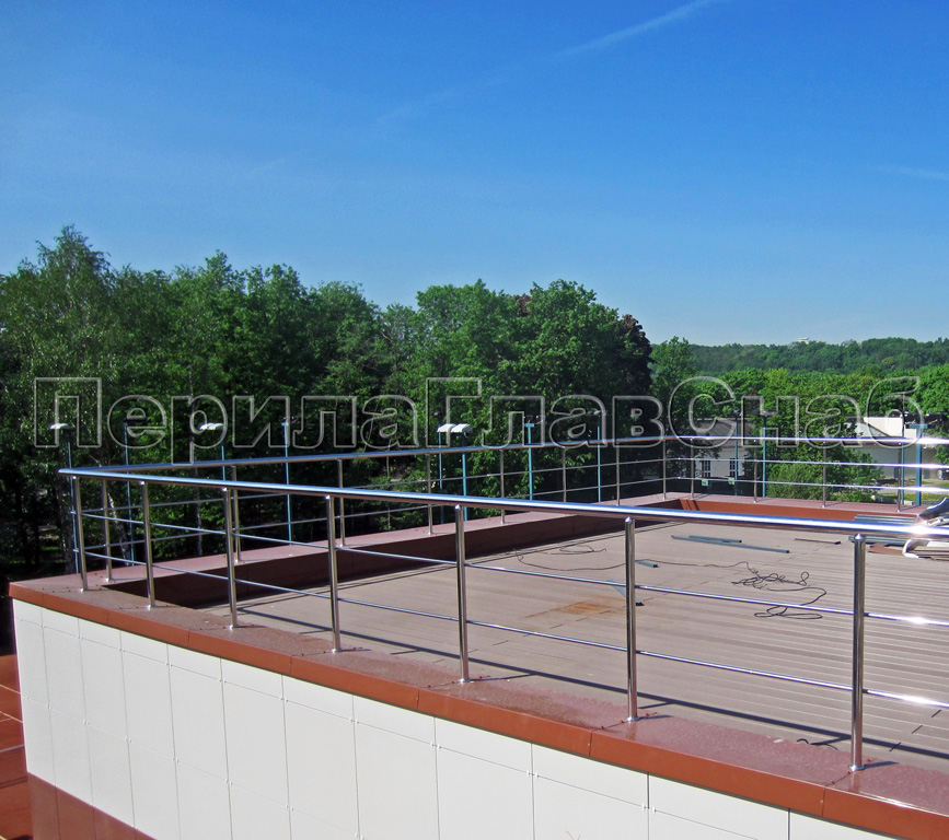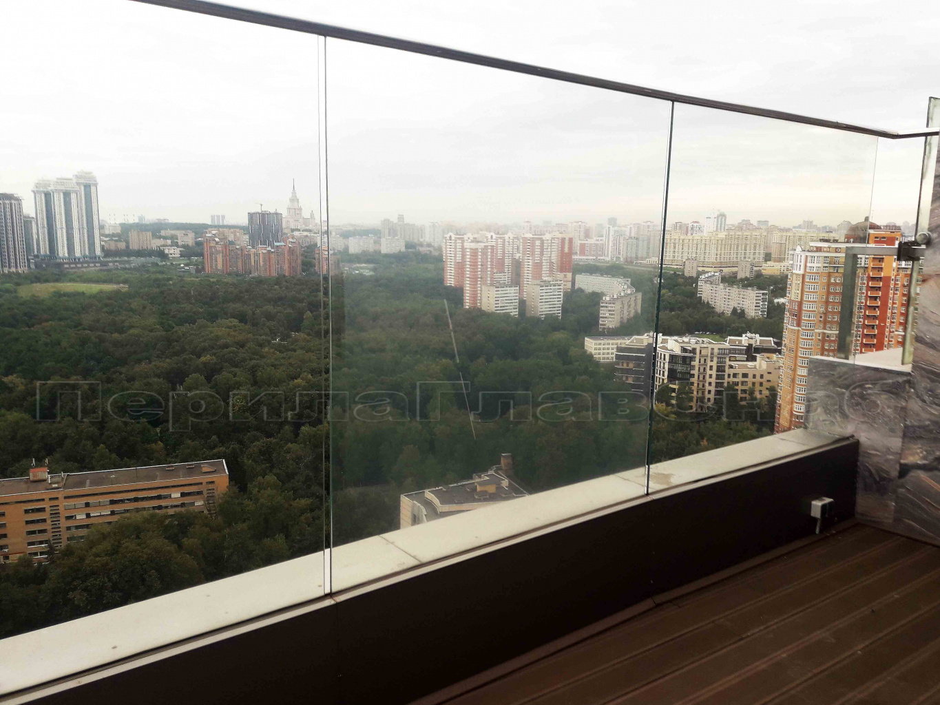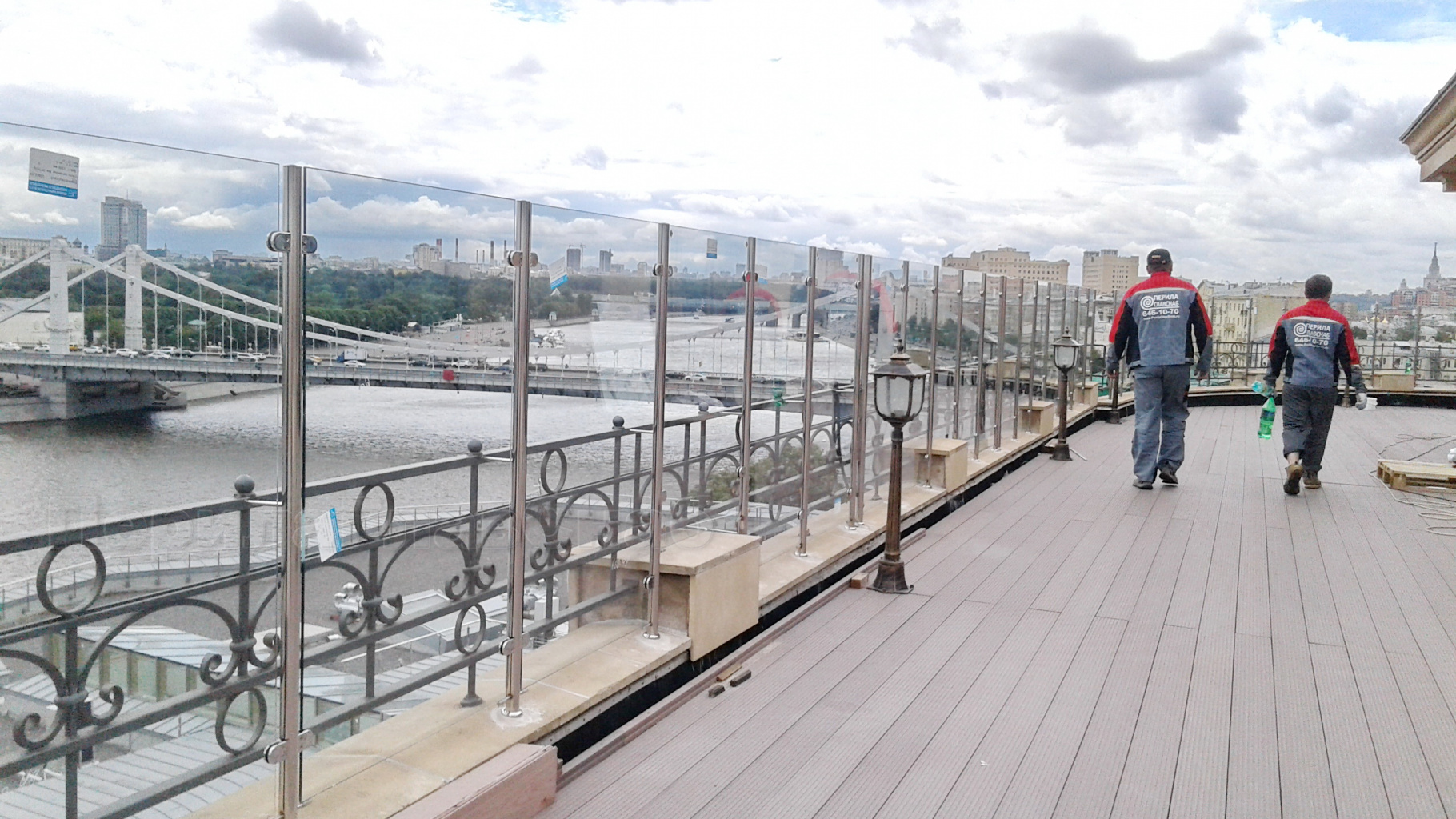 Стеклянные ограждения кровли со стойками на крыше многоэтажного дома. Дешевый аналог.