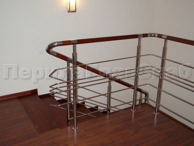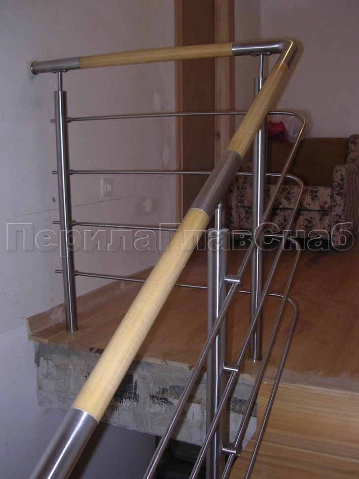 Три ригеля на сварке, квадратный деревянный поручень и круглые стойки