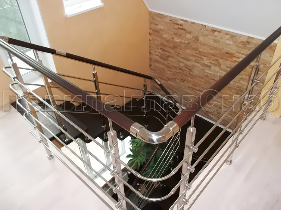 Нержавеющие ограждения без ригелей с круглым деревянным поручнем и стойками с деревянными вставками