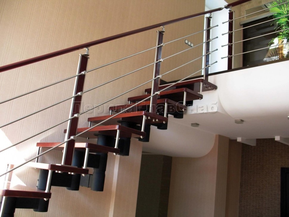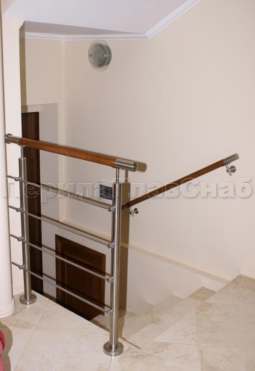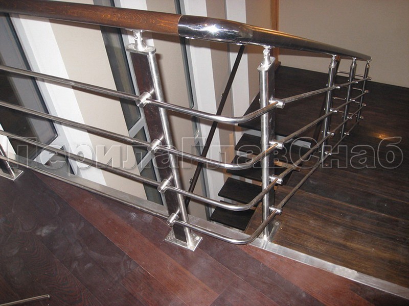 Четыре ригеля на держателях, круглый деревянный поручень и квадратные стойки