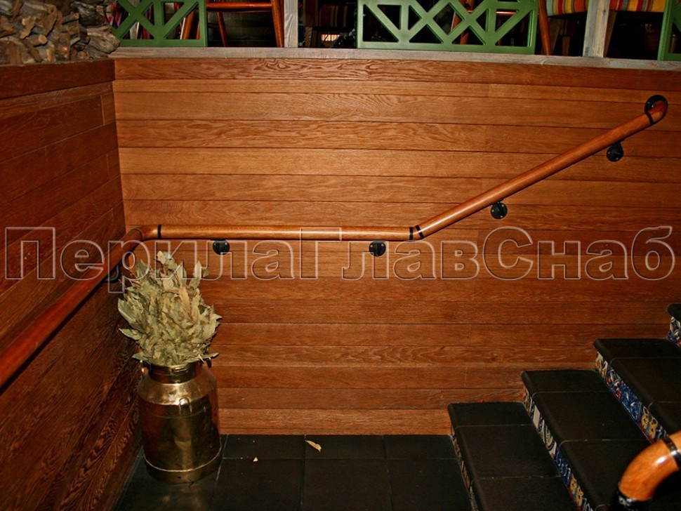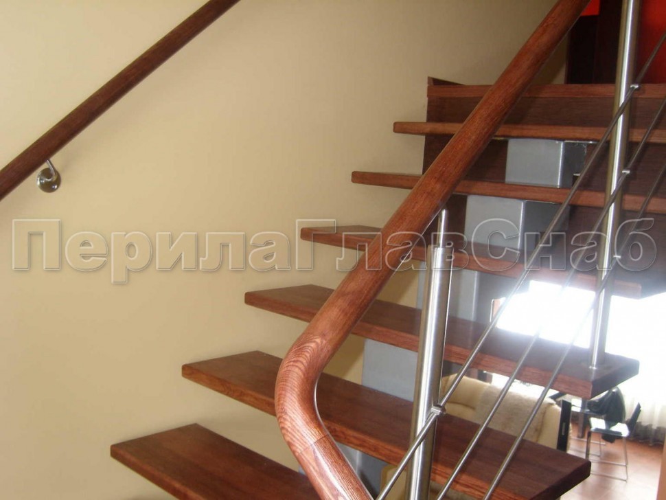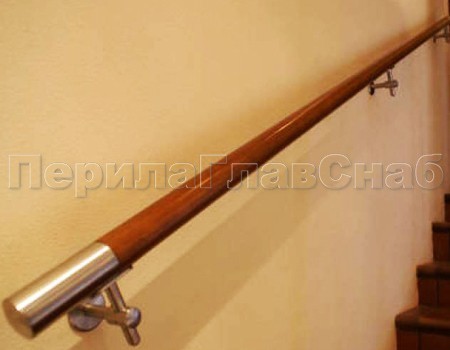 При завязке пристенного поручня с поручнем основных ограждений можно использовать специальные деревянные сегменты, которые крепятся к поручню через штифт + клей + специальное нержавеющее соединительное кольцо. Дешевле использовать шарнирные повороты. Надежнее использовать нержавеющие отводы, которые через саморез крепятся к поручням.