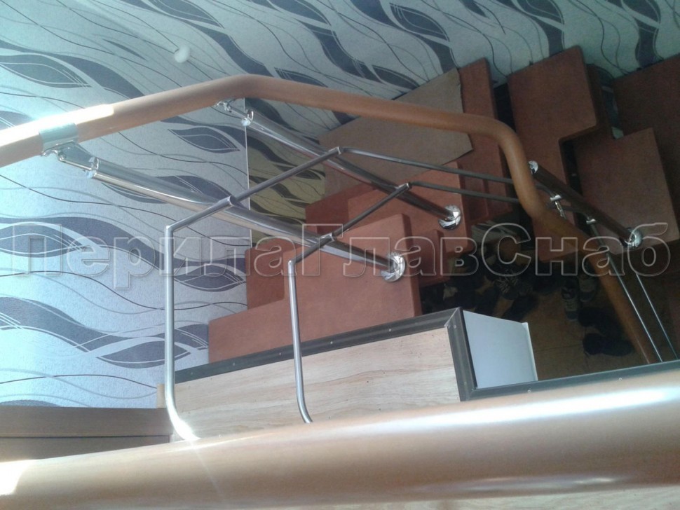 Нержавеющие ограждения без ригелей с круглым деревянным поручнем и стойками с деревянными вставками
