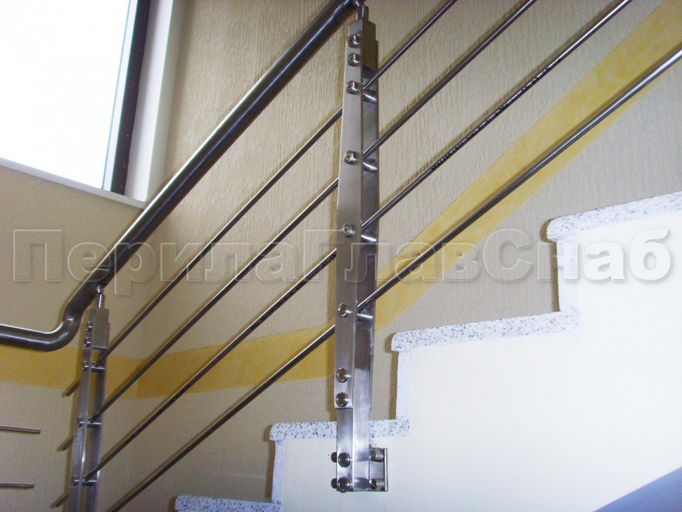 Четыре ригеля на держателях, круглый поручень и квадратные стойки