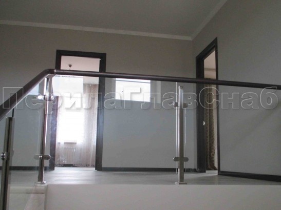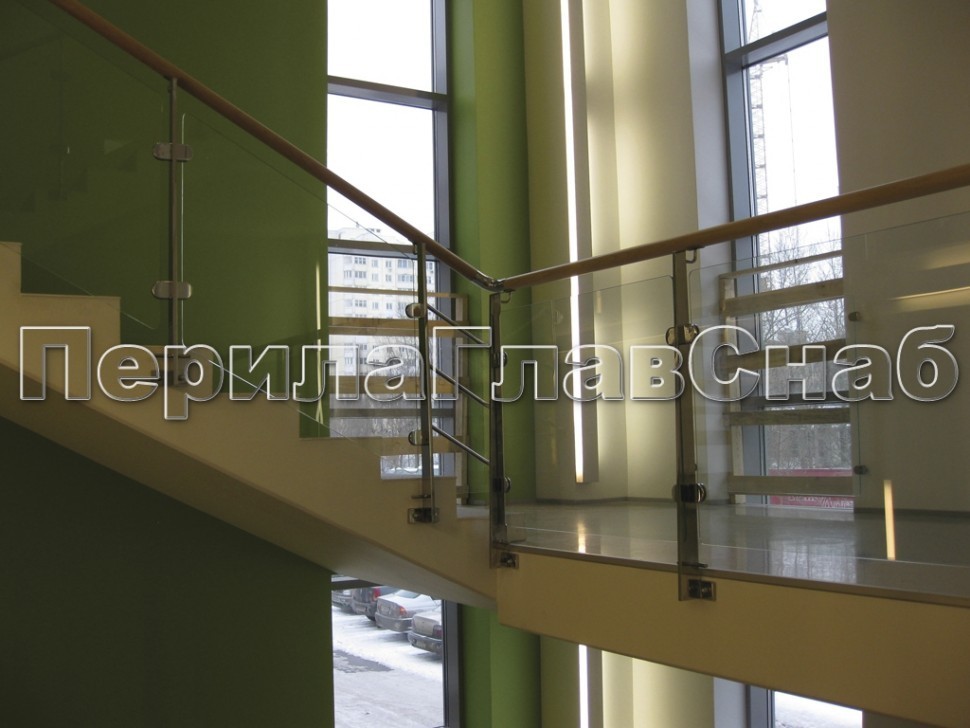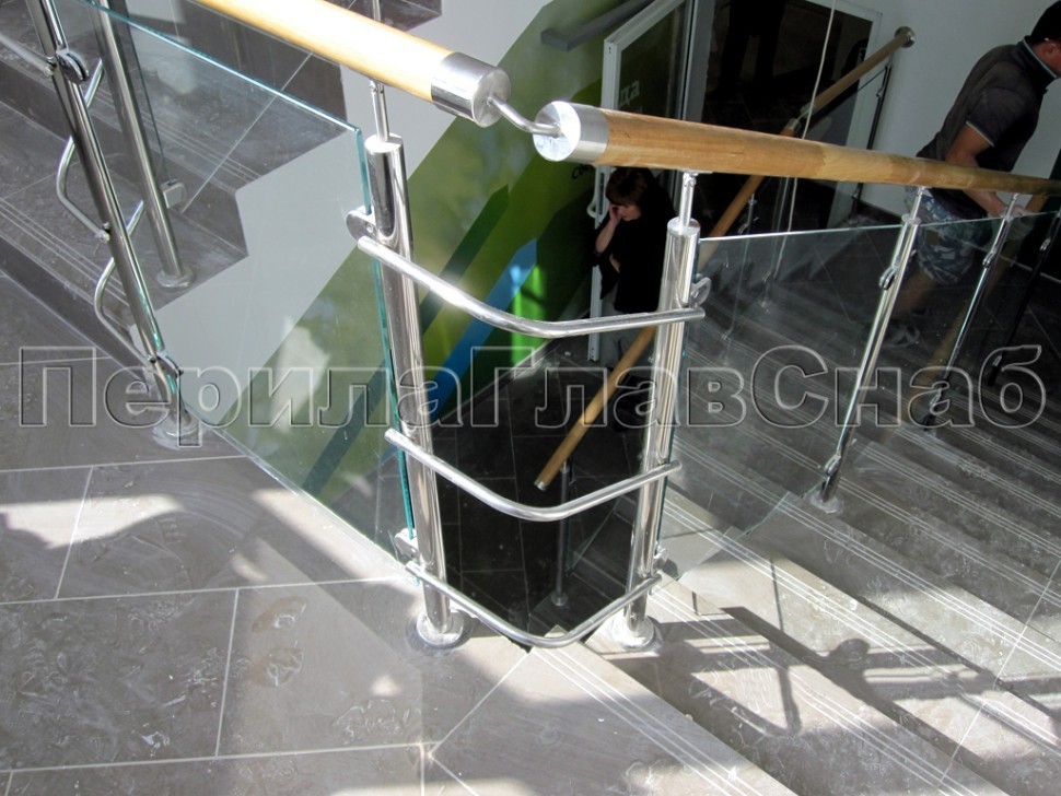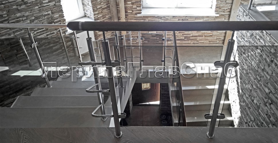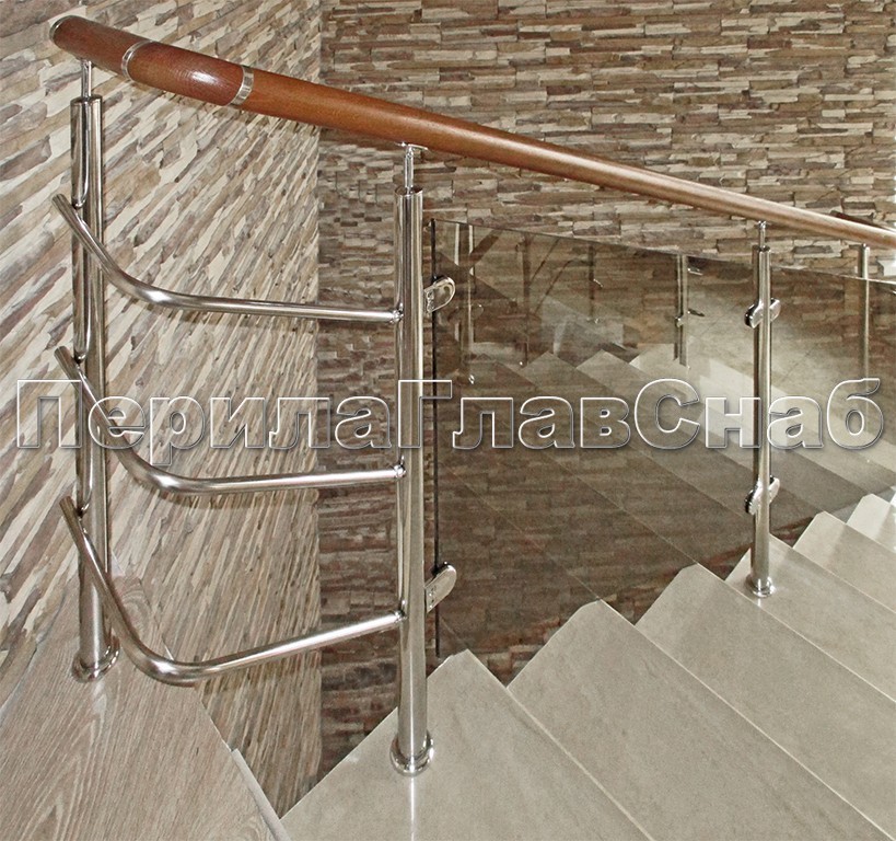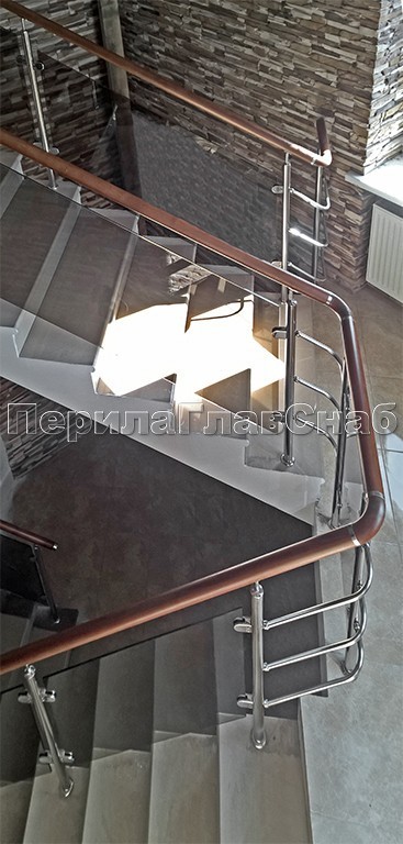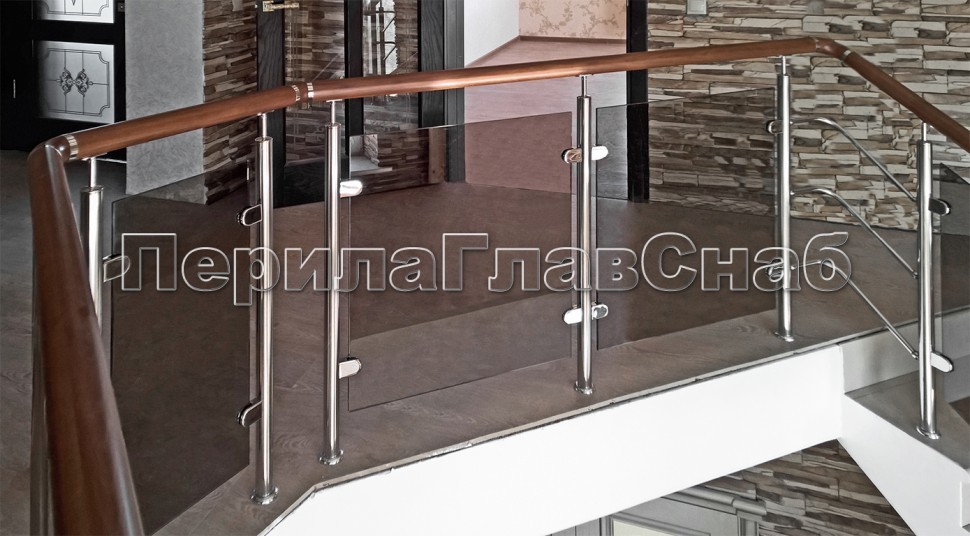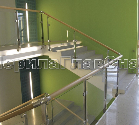 Записаться на встречу Ограждение с деревянным поручнем, стеклом и стойками