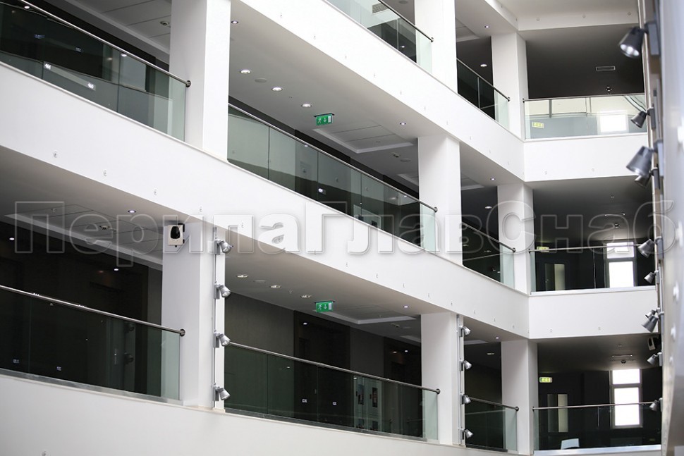 Ограждение с профильным поручнем с пазом на точечном креплении на лестнице