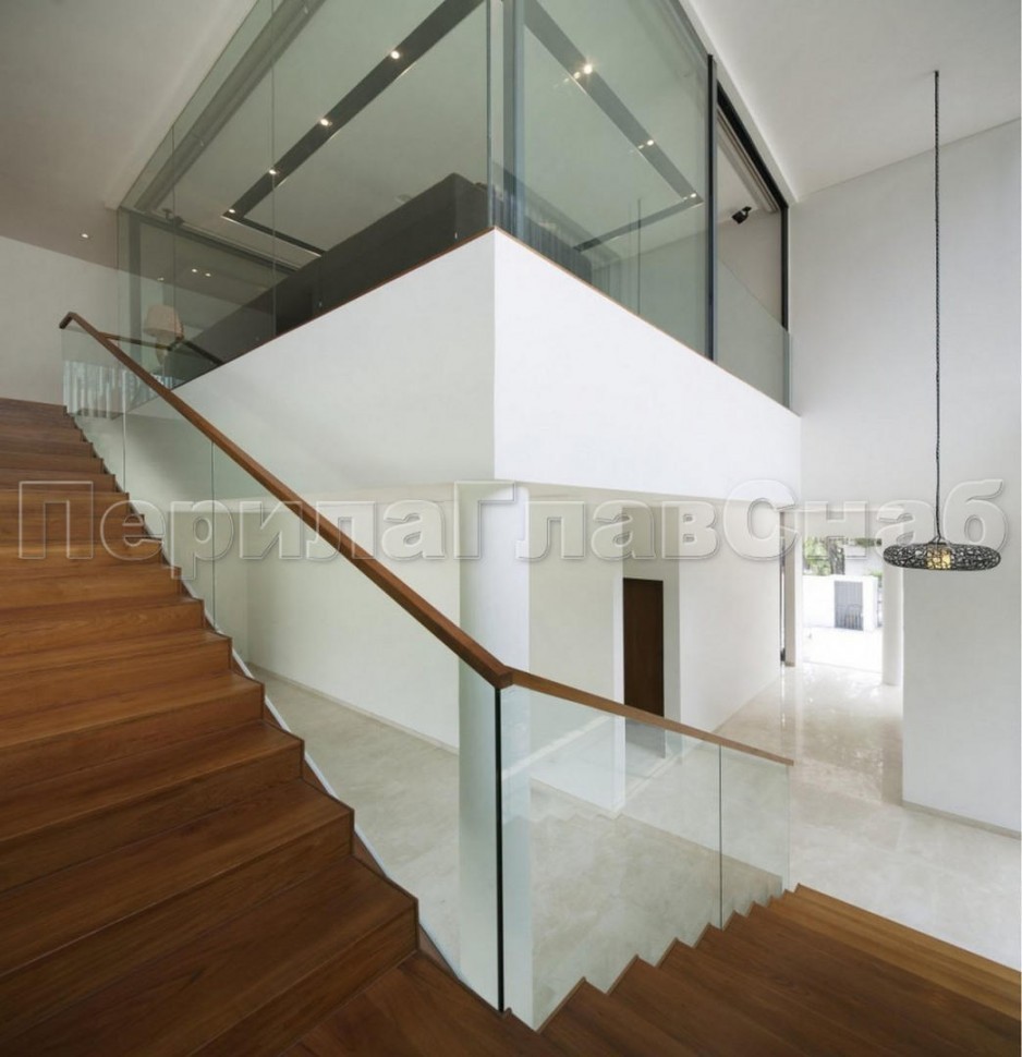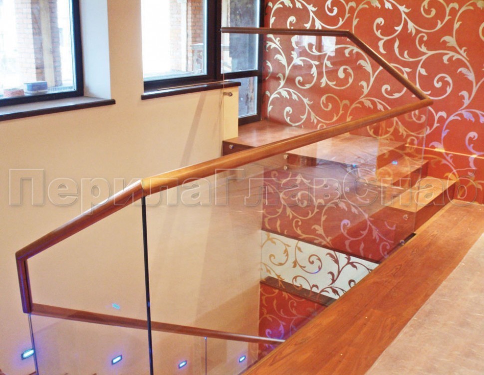 Ограждение с деревянным поручнем на точечном креплении на лестнице