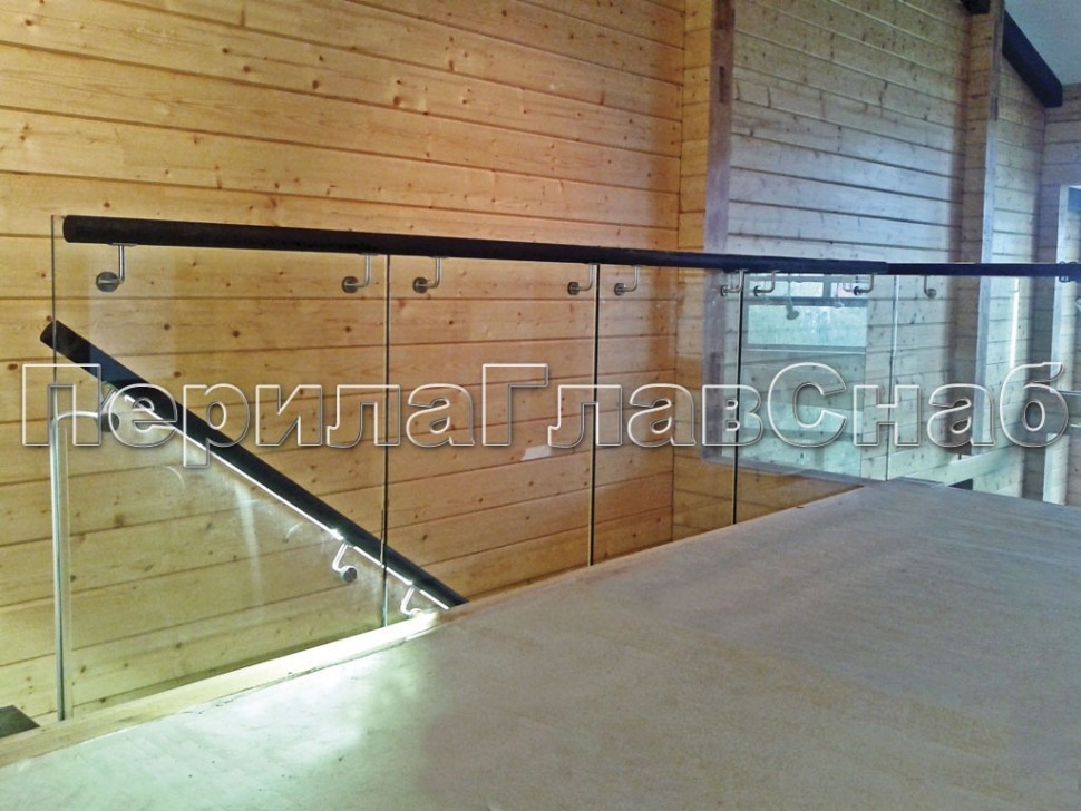 Ограждение с деревянным поручнем на точечном креплении на лестнице