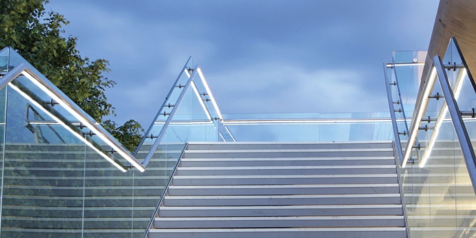Ограждение с профильным поручнем с пазом на точечном креплении на лестнице