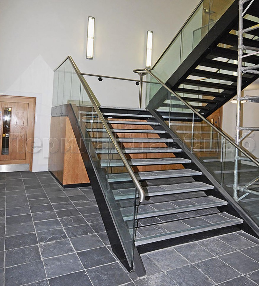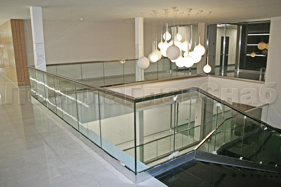Ограждение с профильным поручнем с пазом на точечном креплении на лестнице