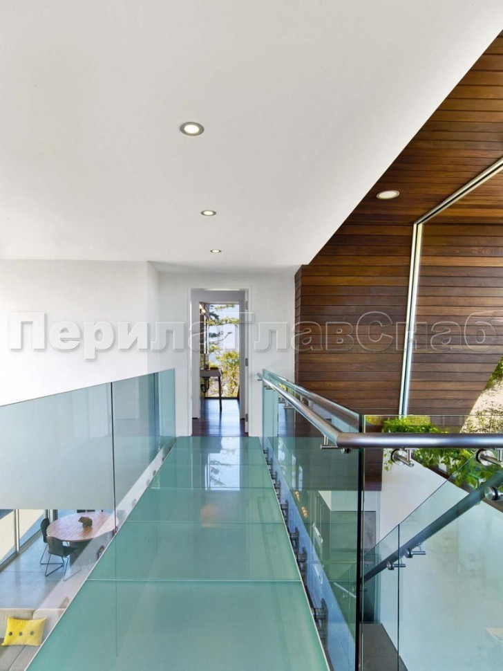 Ограждение с профильным поручнем с пазом на точечном креплении на лестнице
