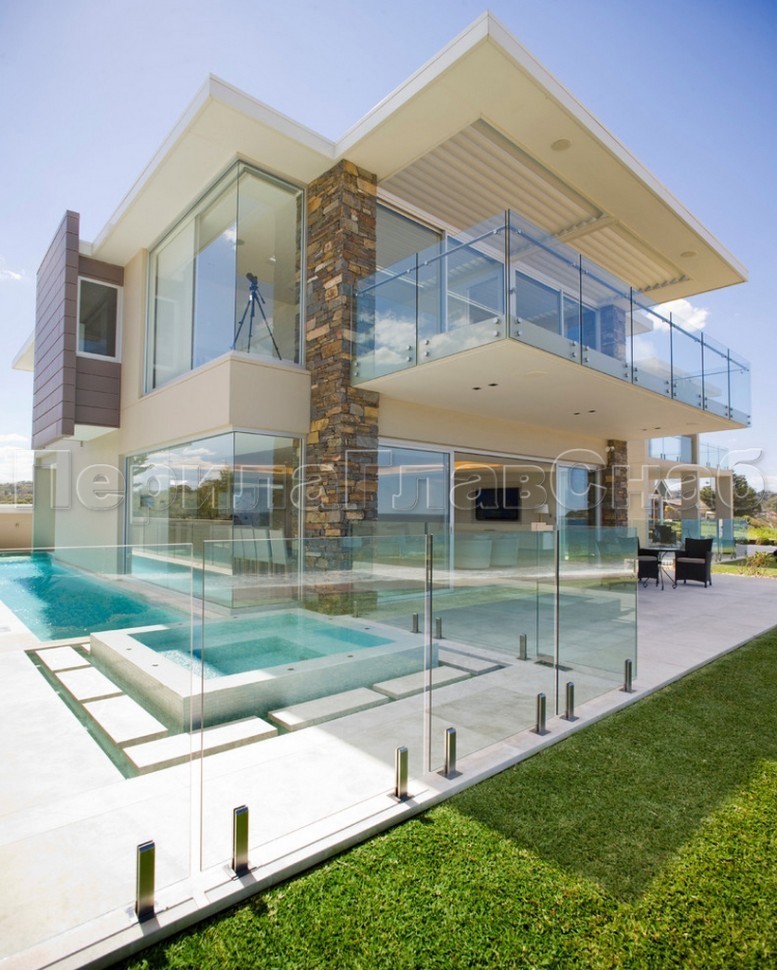 Ограждение с деревянным поручнем на выносе на точечном креплении