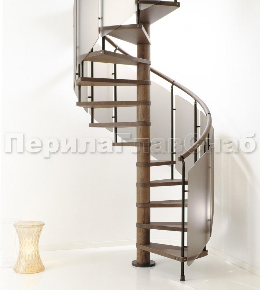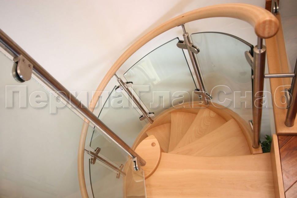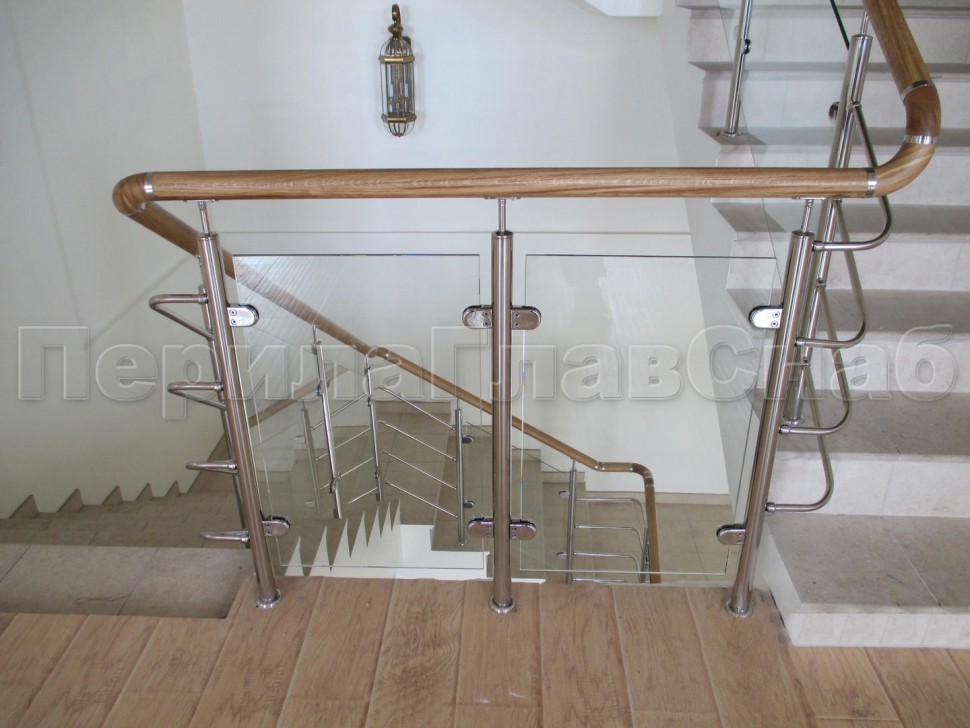 Ограждение с круглым деревянным поручнем с зажимными стеклодержателями и стойками с деревянными вставками