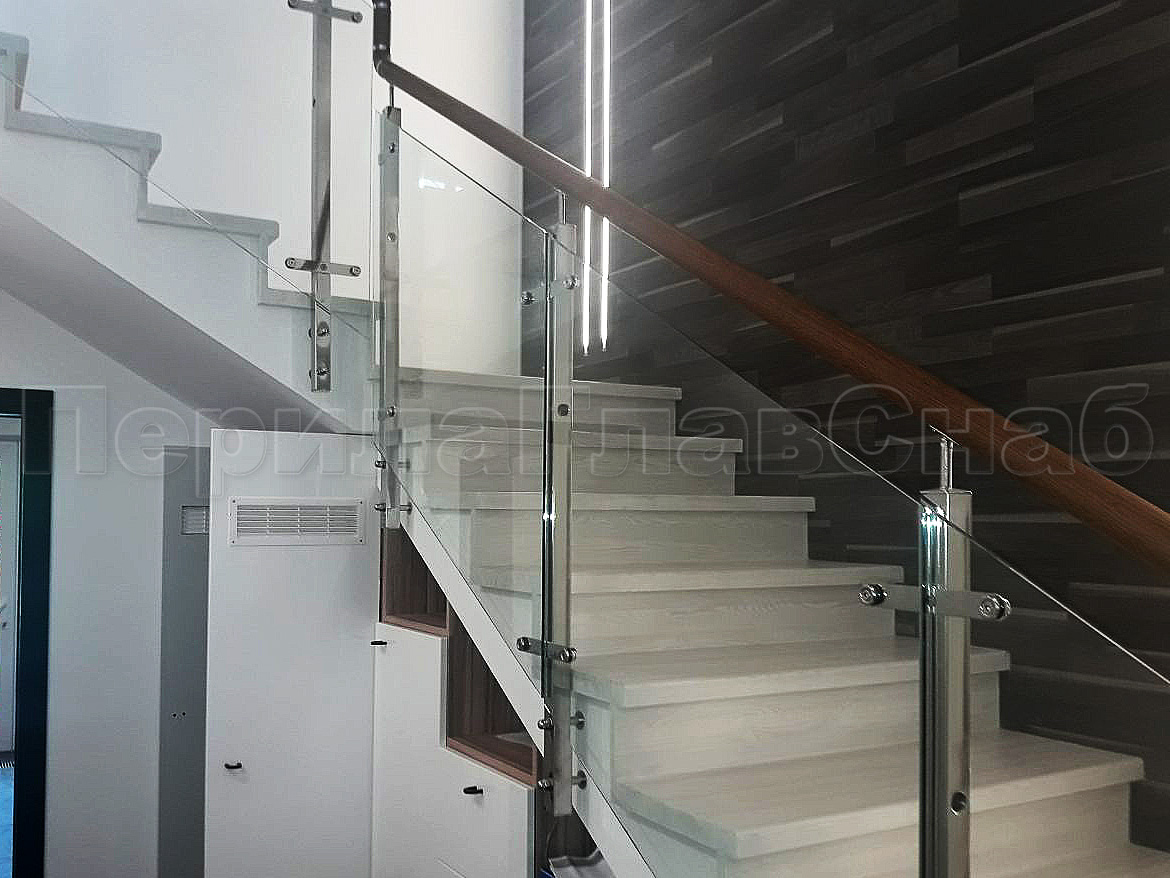 Ограждение лестницы с квадратными стойками и пластинчатыми стеклодержателями